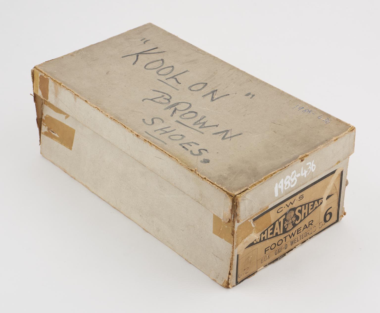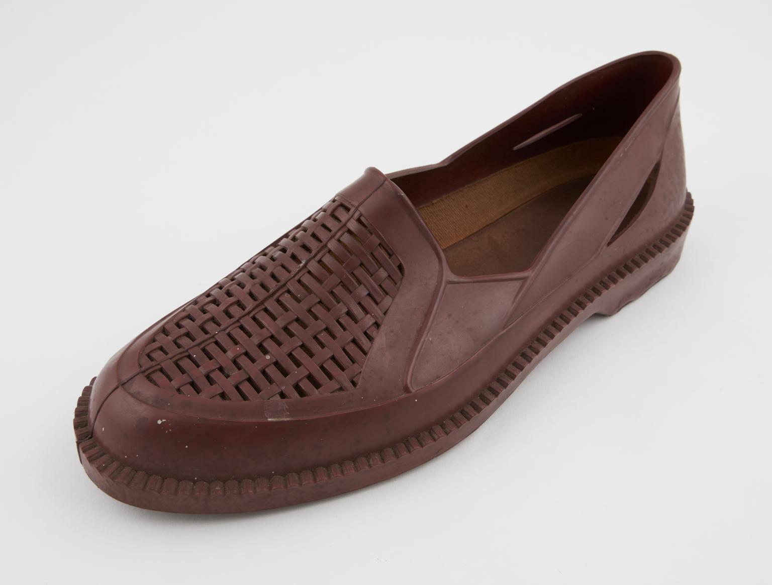 Left shoe, from a pair of men's brown "Koolon" plastic shoes, size 6, made of Utrilon by U.I.M., England, c. 1950.