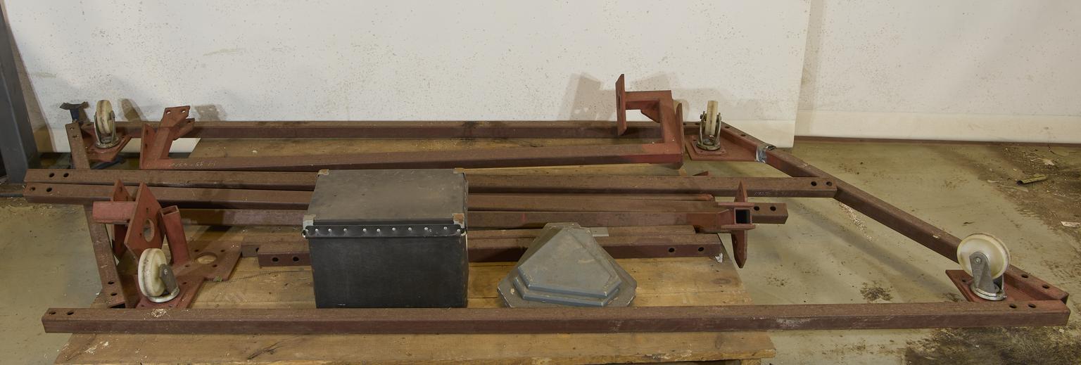 The support frame to move Lotus Excel car, unit no. 260F through Museum. This includes the support frame consisting of four white plastic caster wheels and 8 metal struts. Four grey triangular tiles. A box containing 5 feet from the supporting frame and lots of screws.