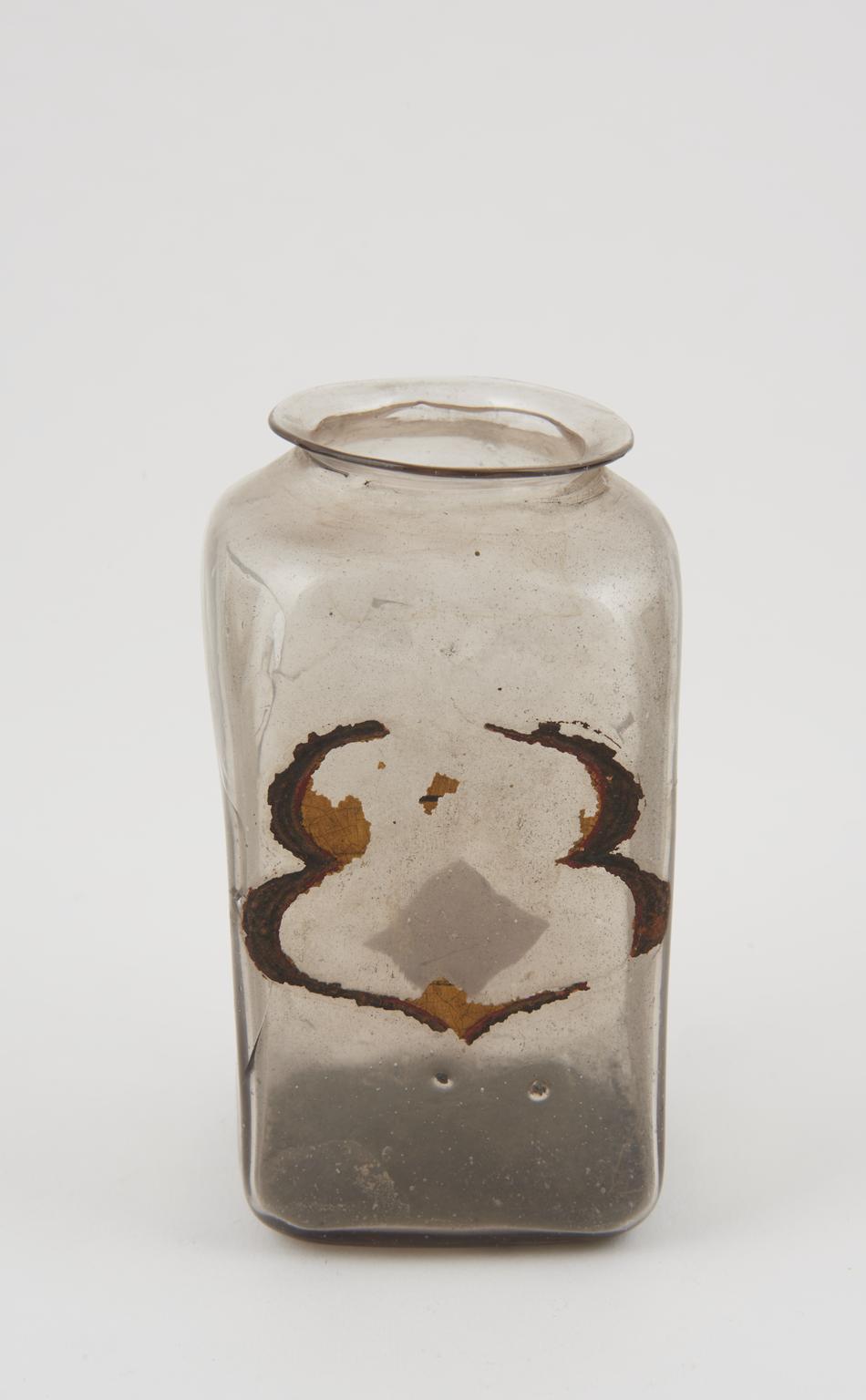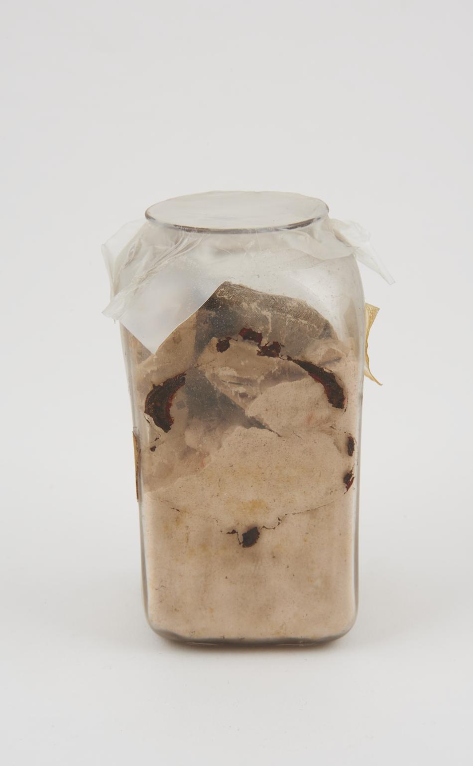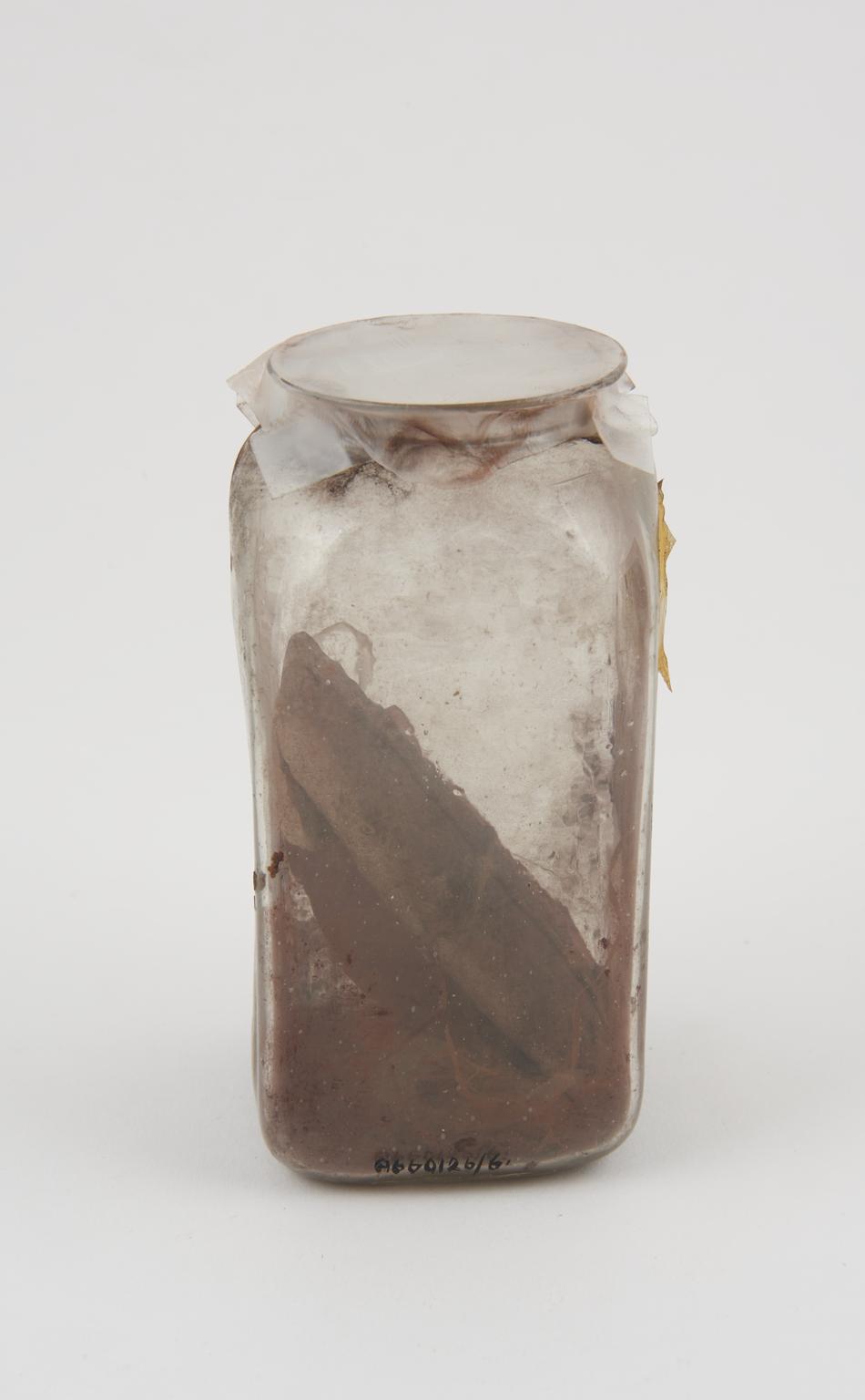 Bottle, clear glass, label worn off, contains smaller glass jar