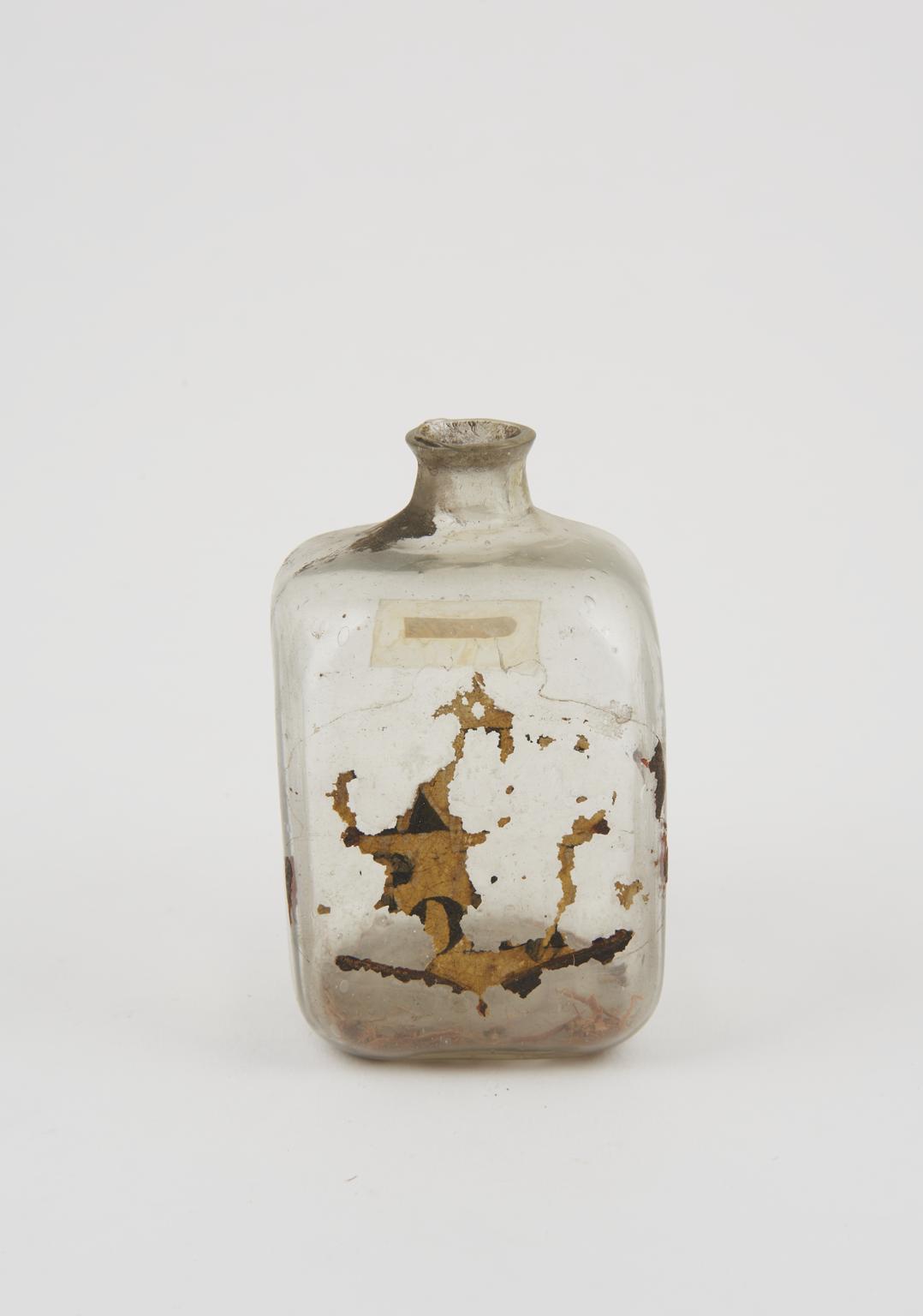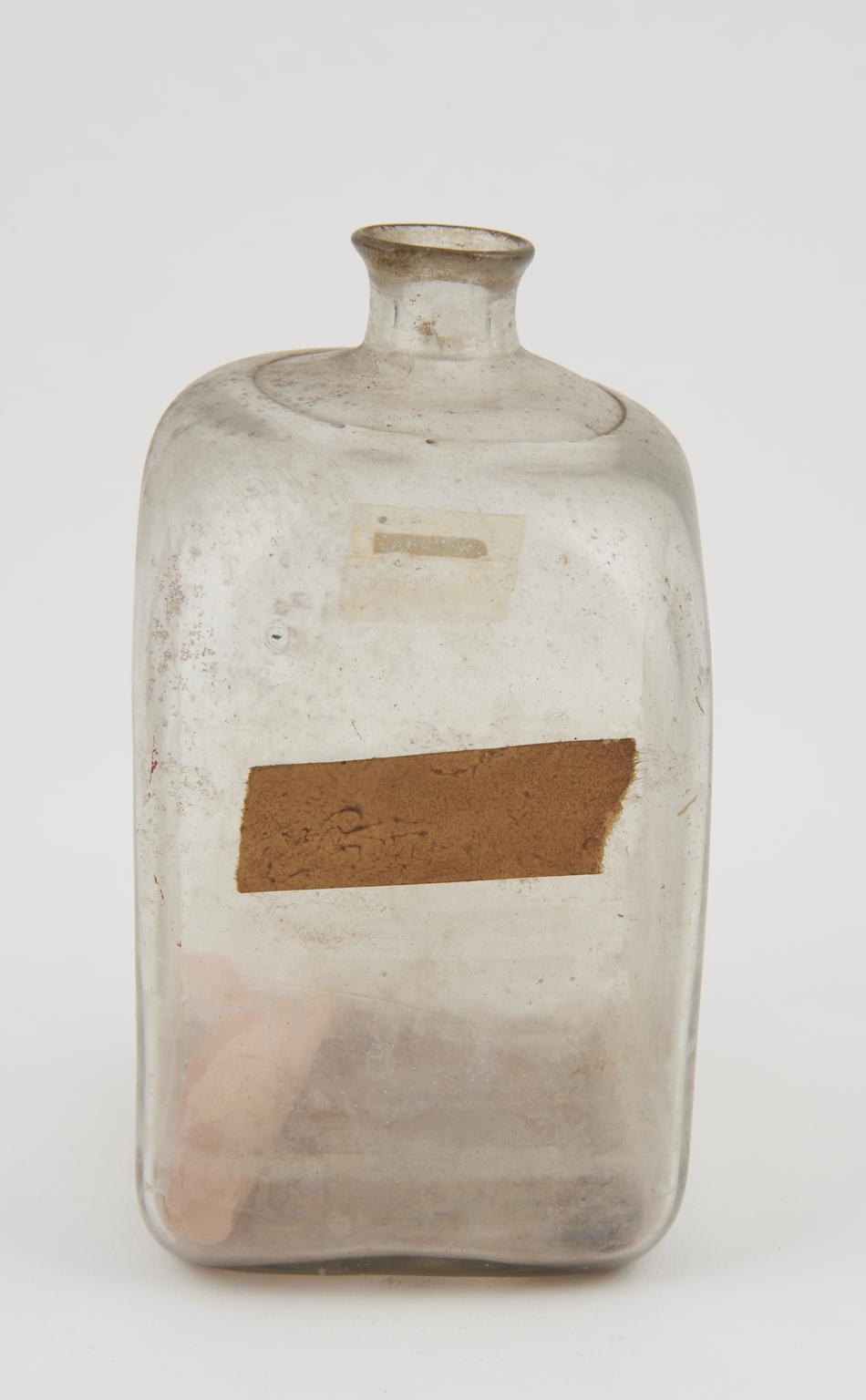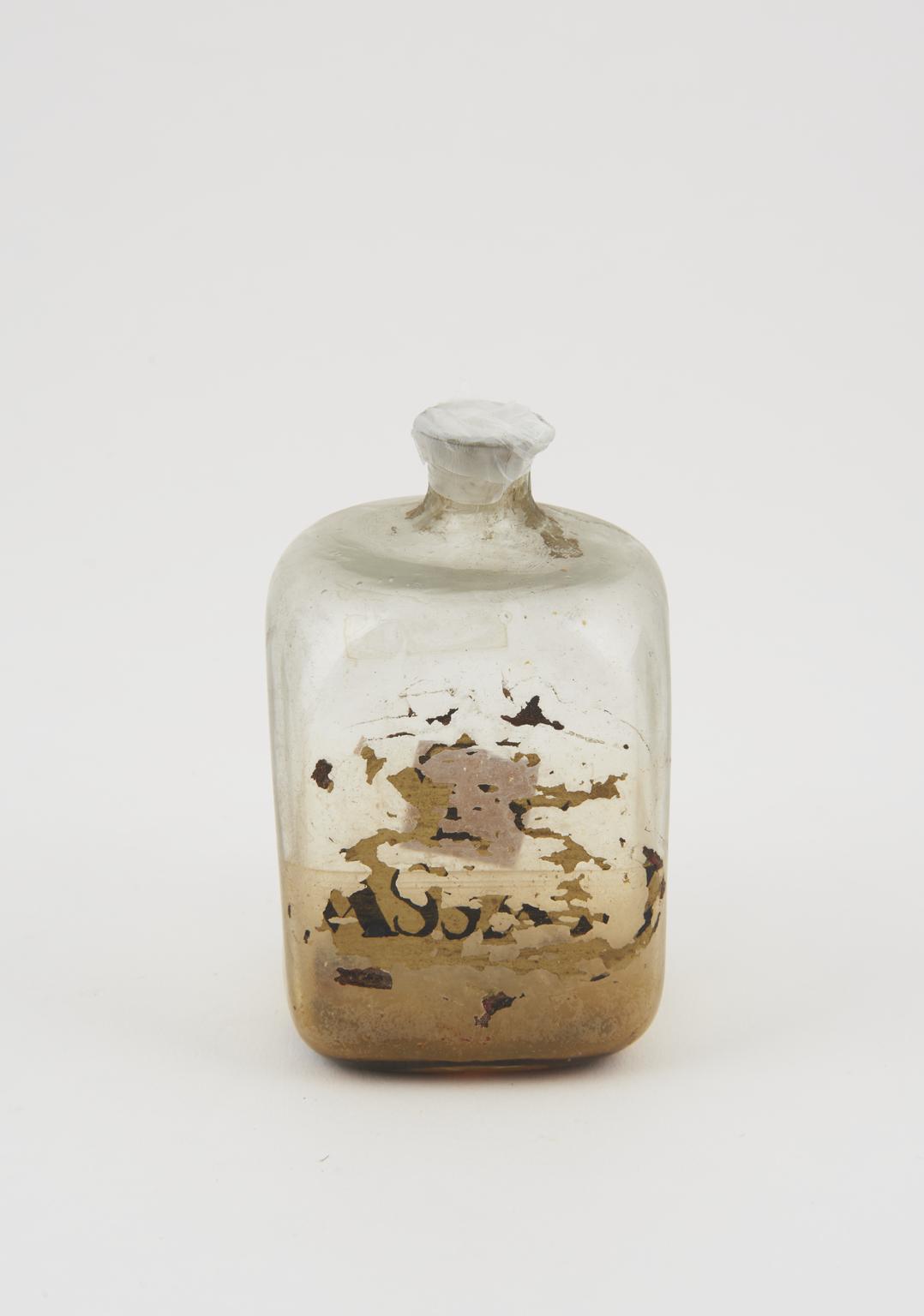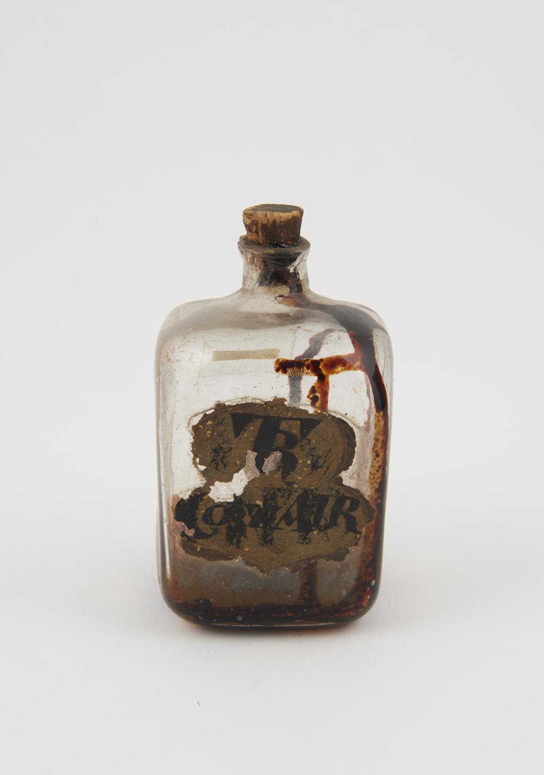 Glass bottle, cork bung, label illegible