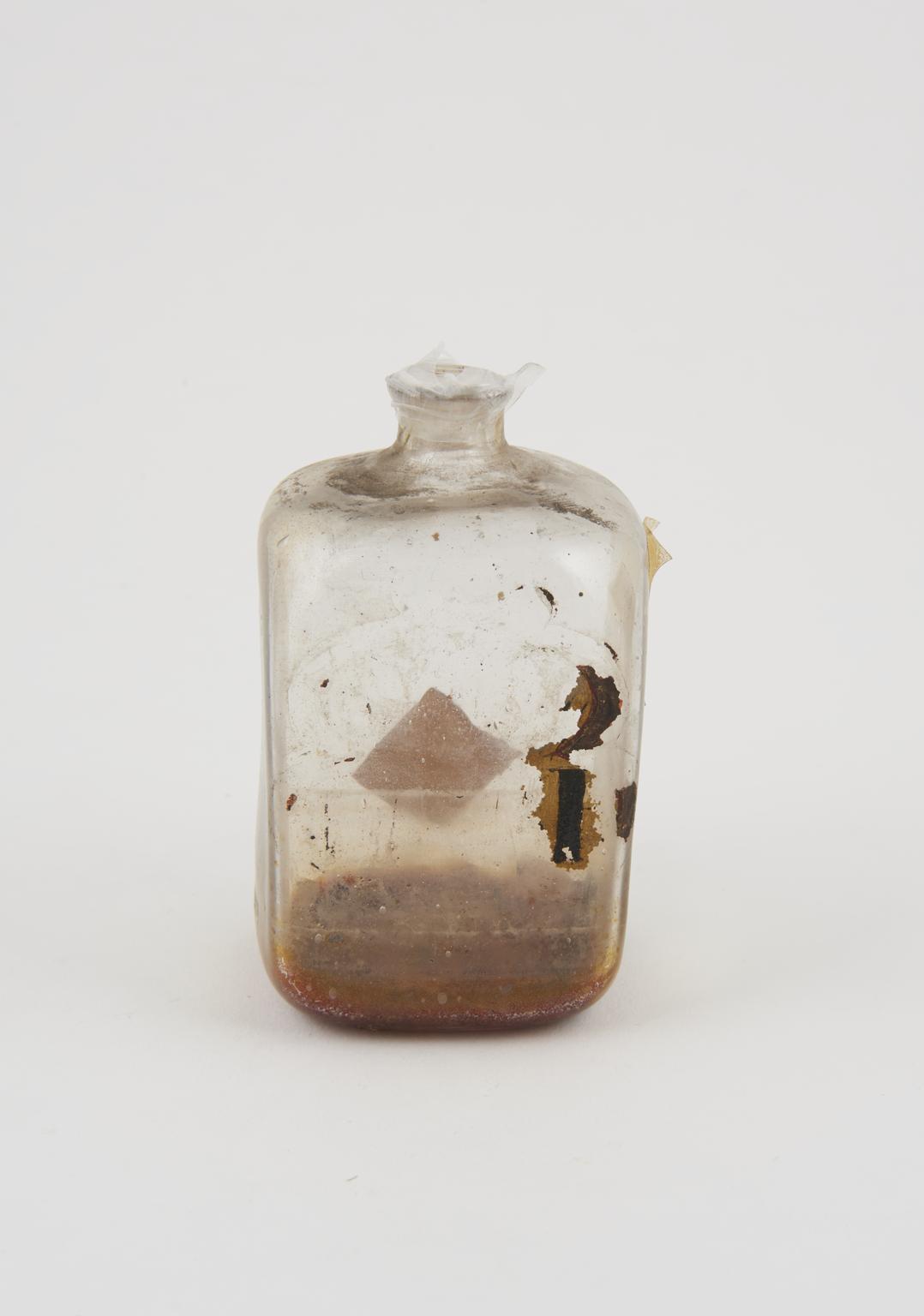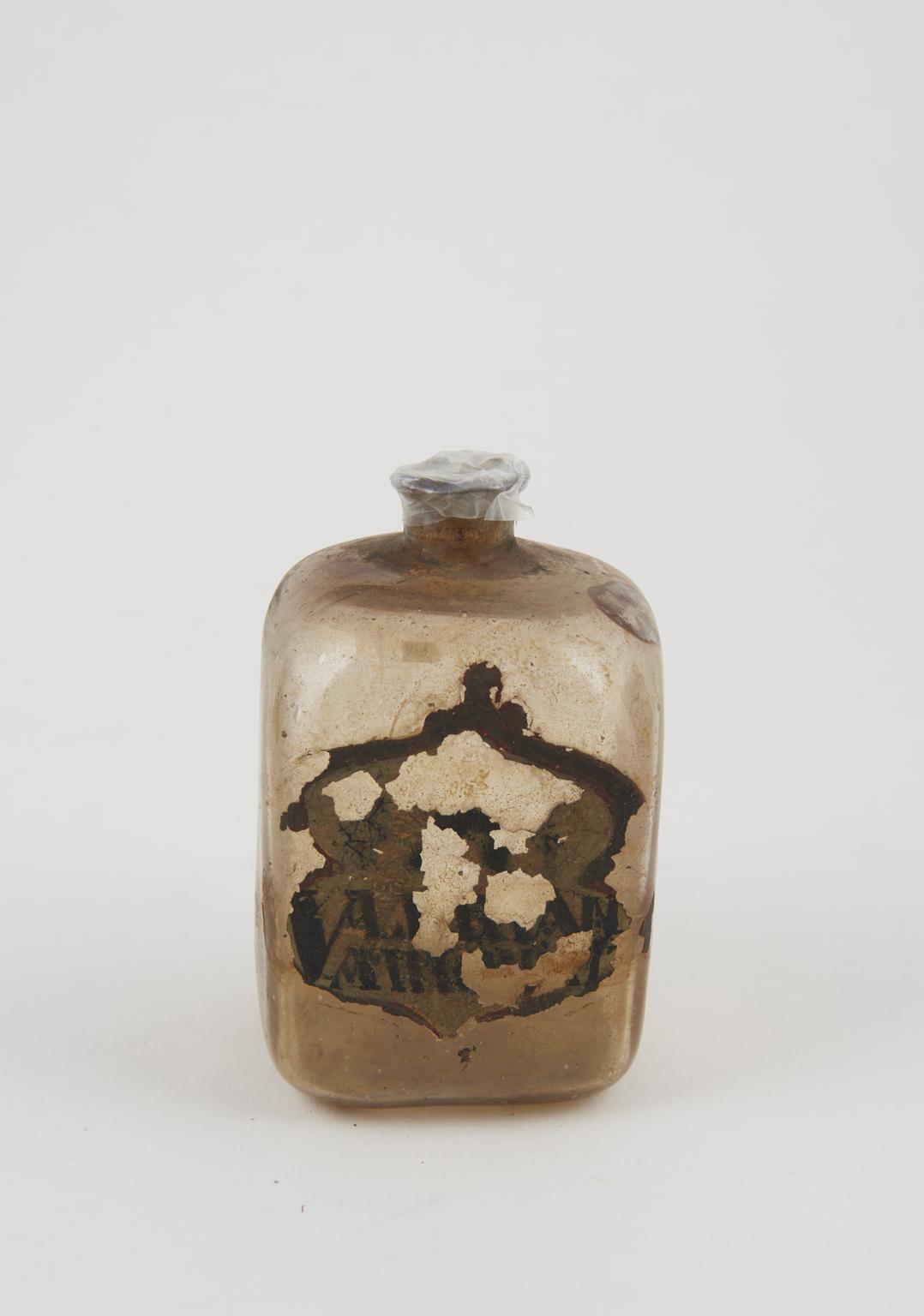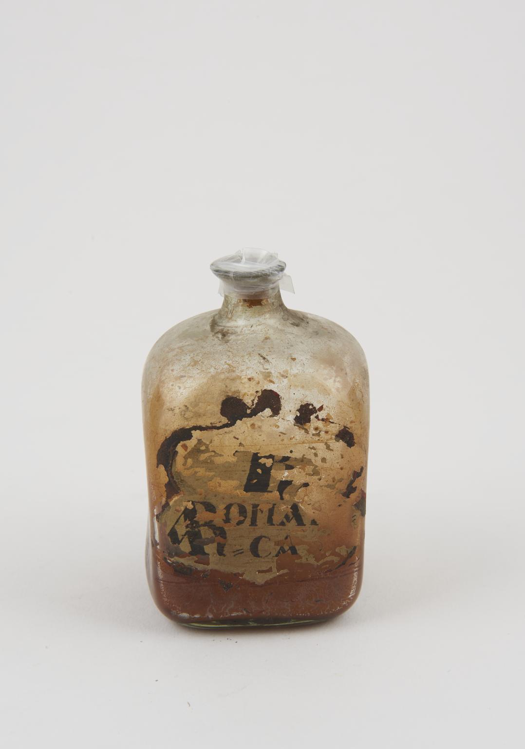 Glass bottle, cork bung, label worn away