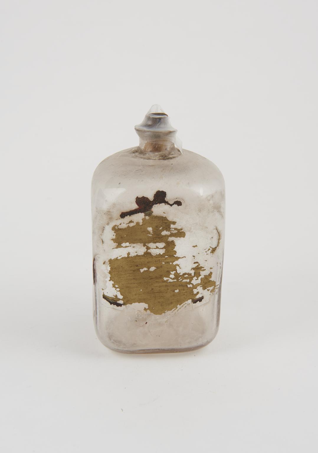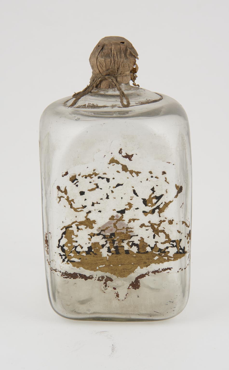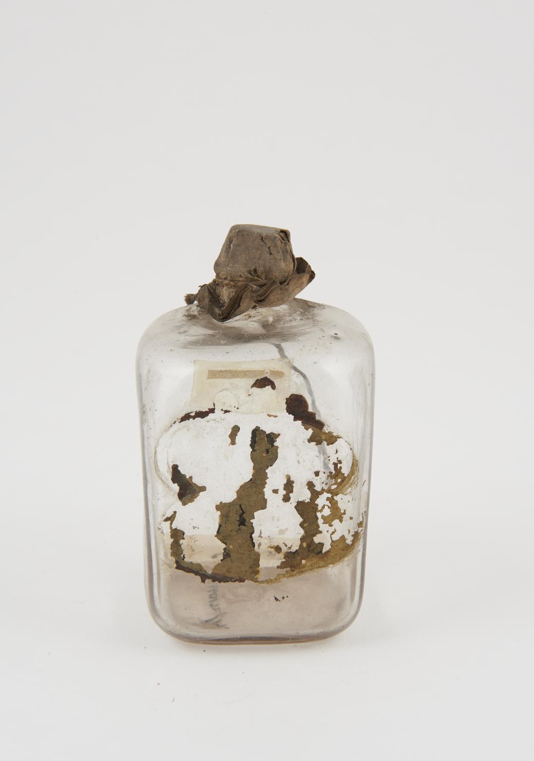 Glass bottle, cork bung, label worn away