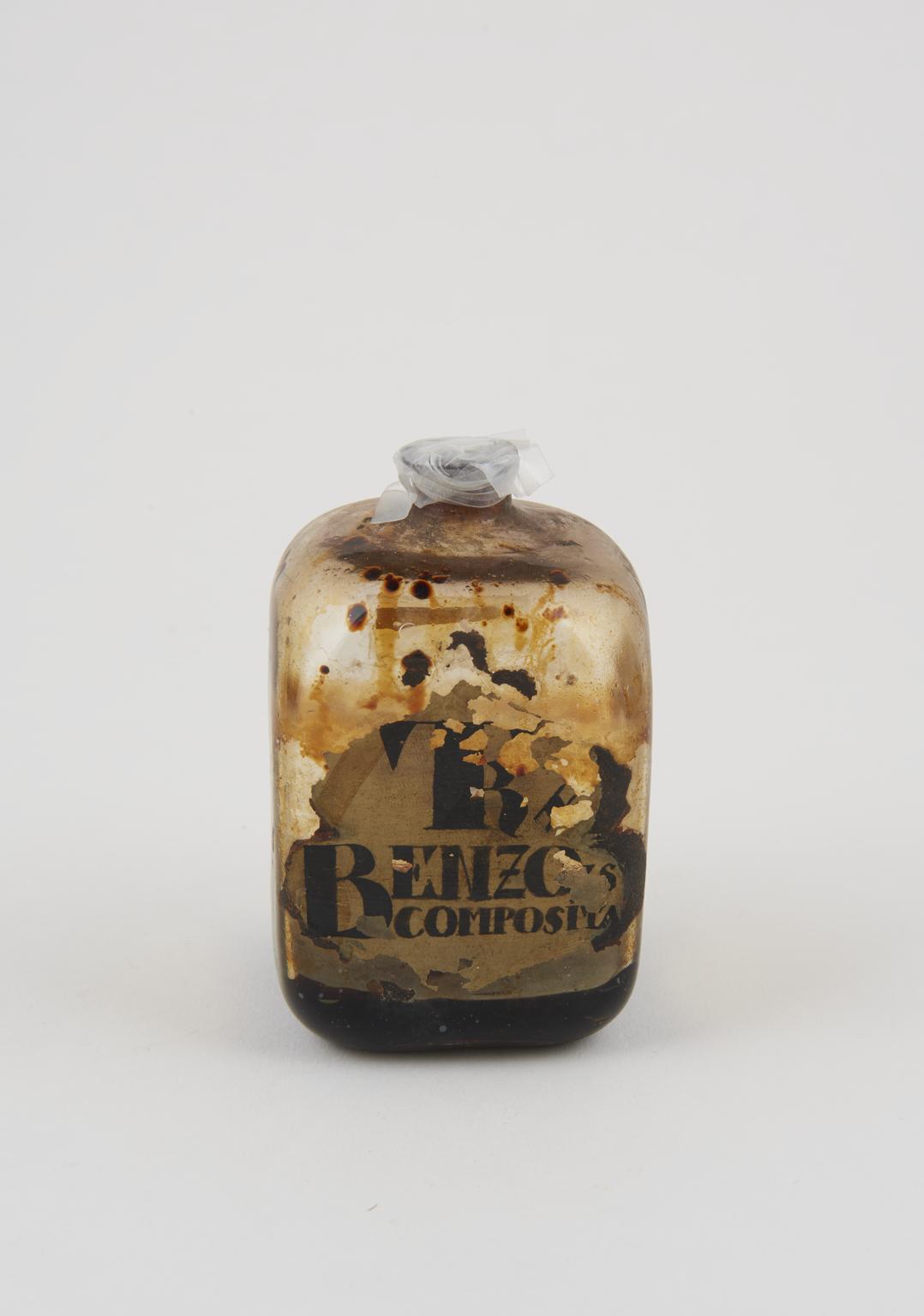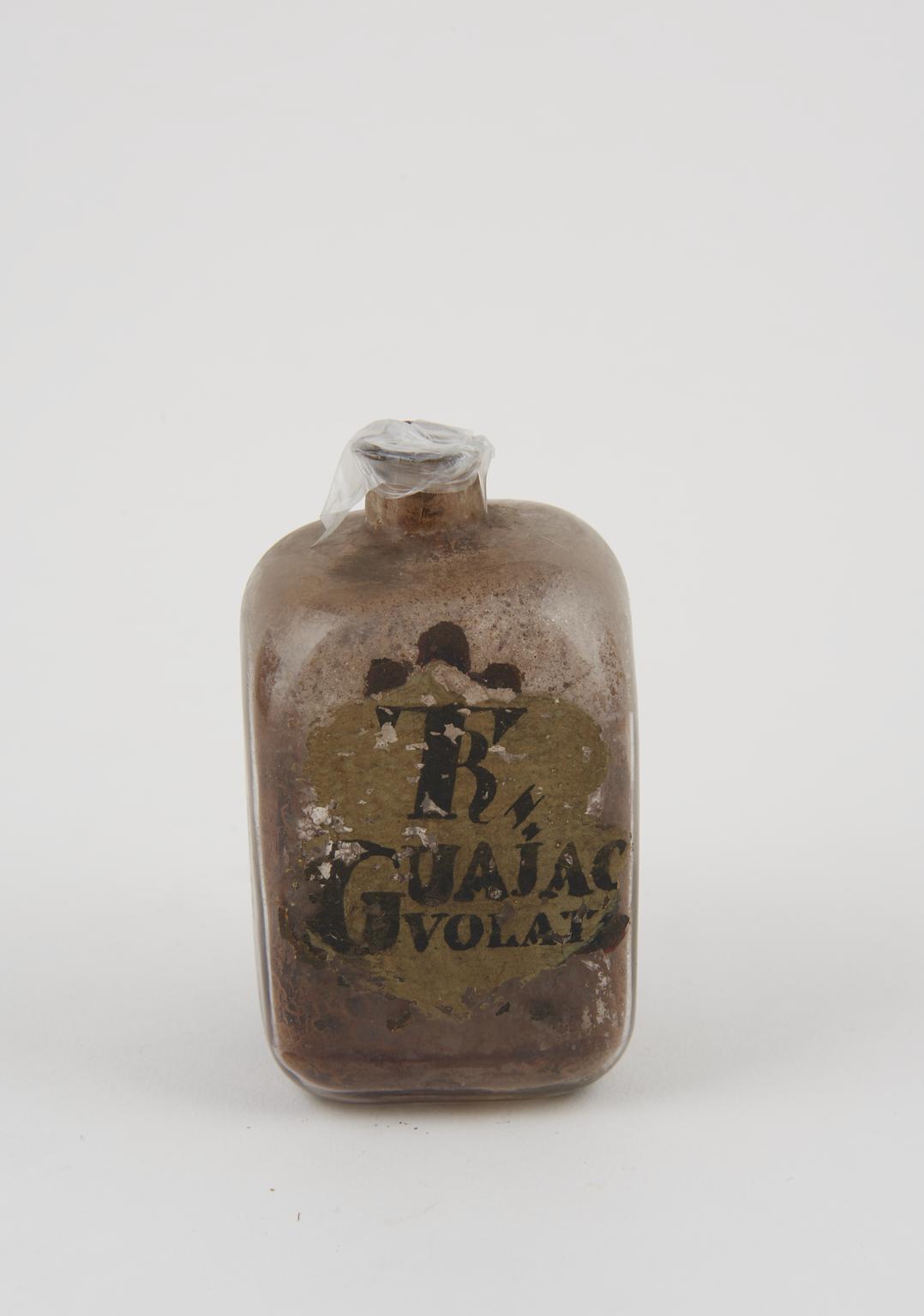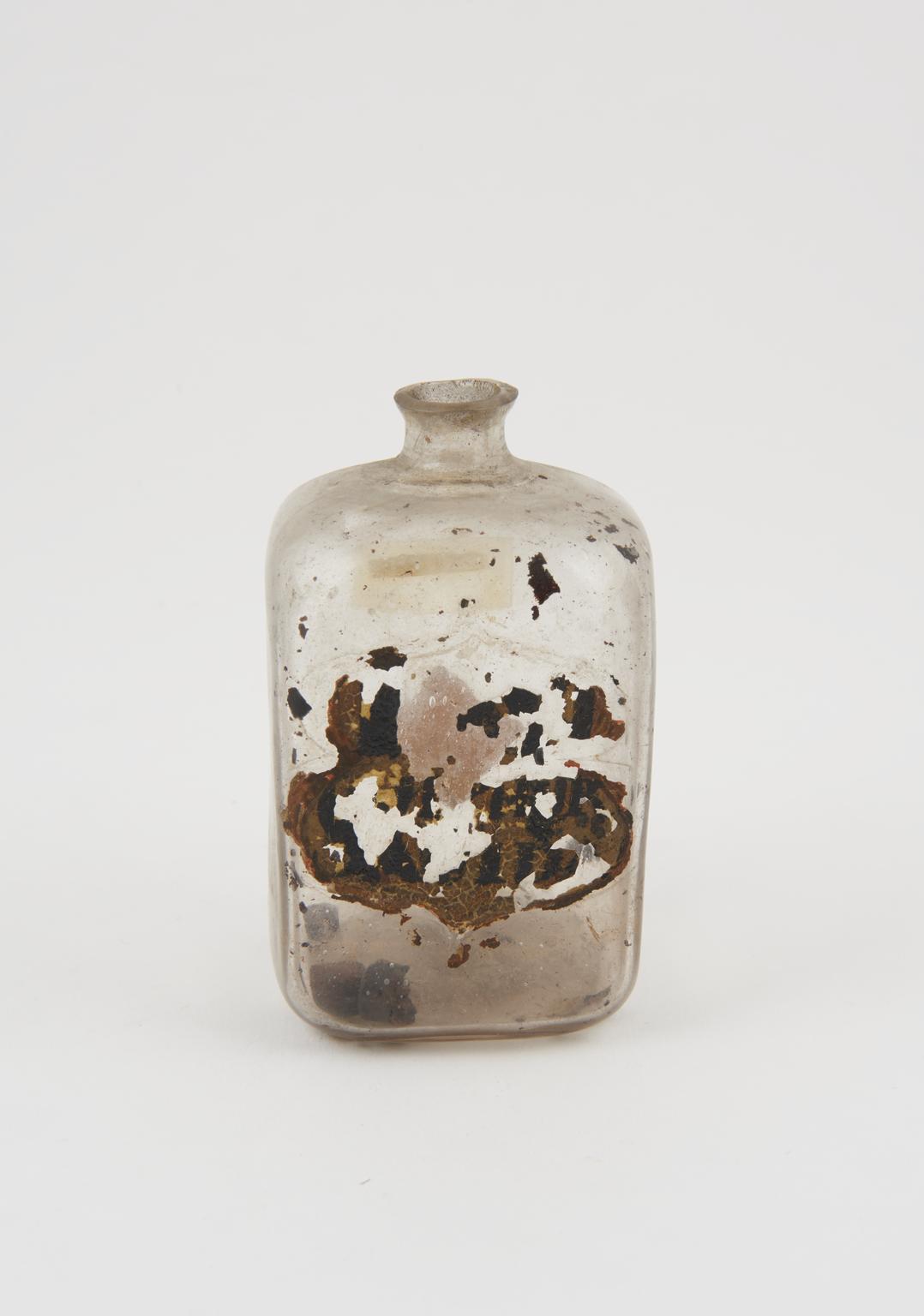 Glass bottle, with painted label,"TR OPII CROC" (opium tincture), empty, stopper missing. 94 mm x 60 mm x 60 mm, 102g. Unknown maker, probably English, 19th century.