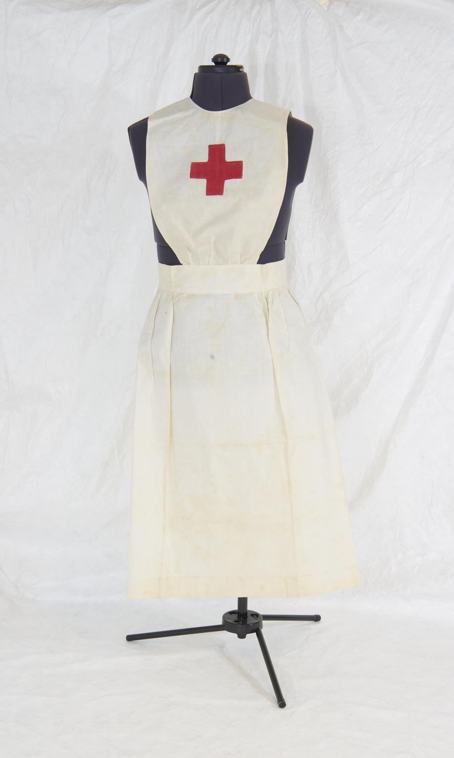 The red cross is an international symbol for first aid. This white cotton apron with a bib was worn by a nurse working in France during the First World War. To cope with the large numbers of wounded men, many women volunteered as nurses or as VADs (Voluntary Aid Detachments) and worked in hospitals behind the front lines in Europe.