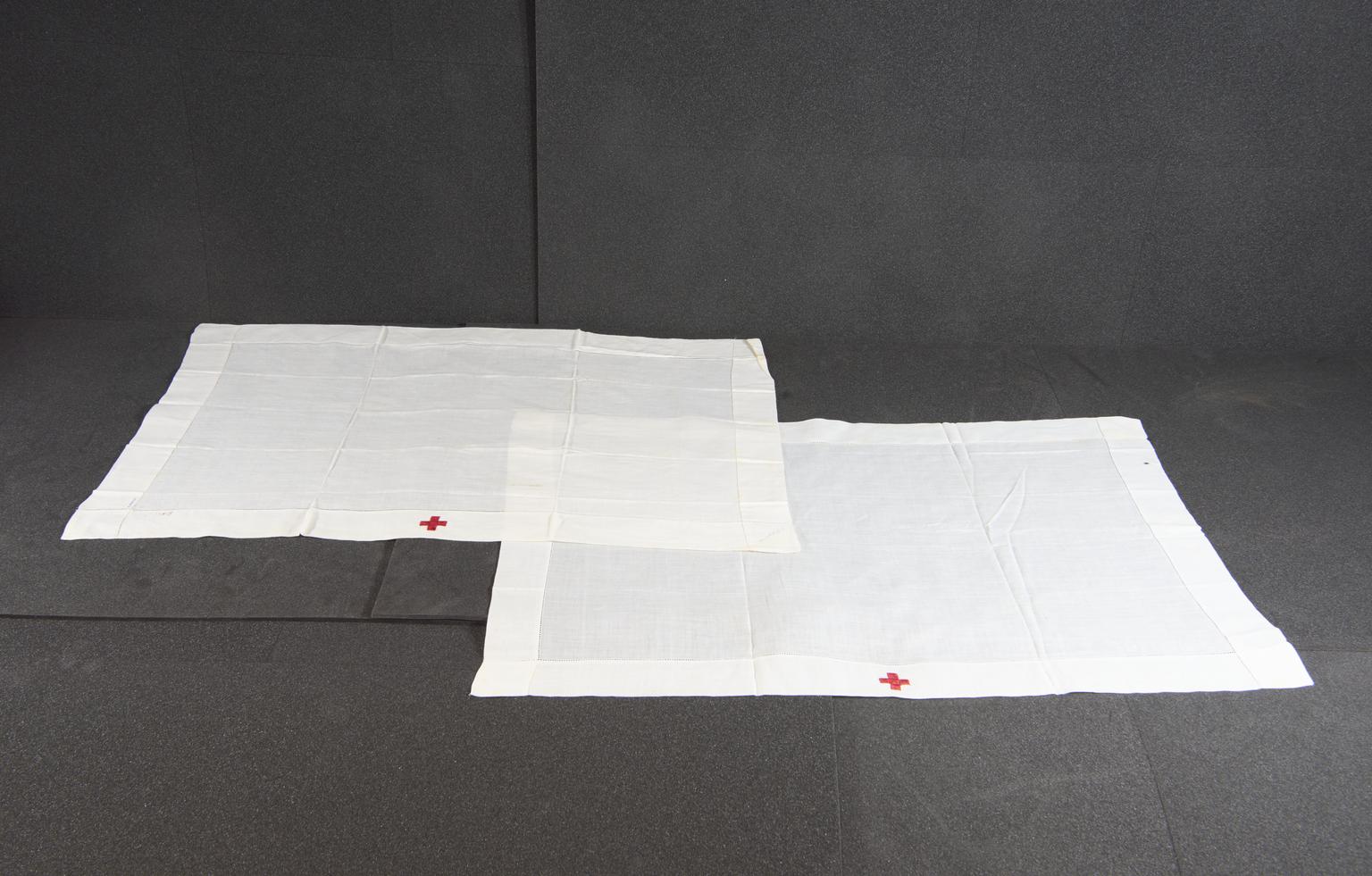 Two white organdie lawn rectangular caps with red cross embroidered at the front, worn by Kathleen Herrick in France, 1914-1918