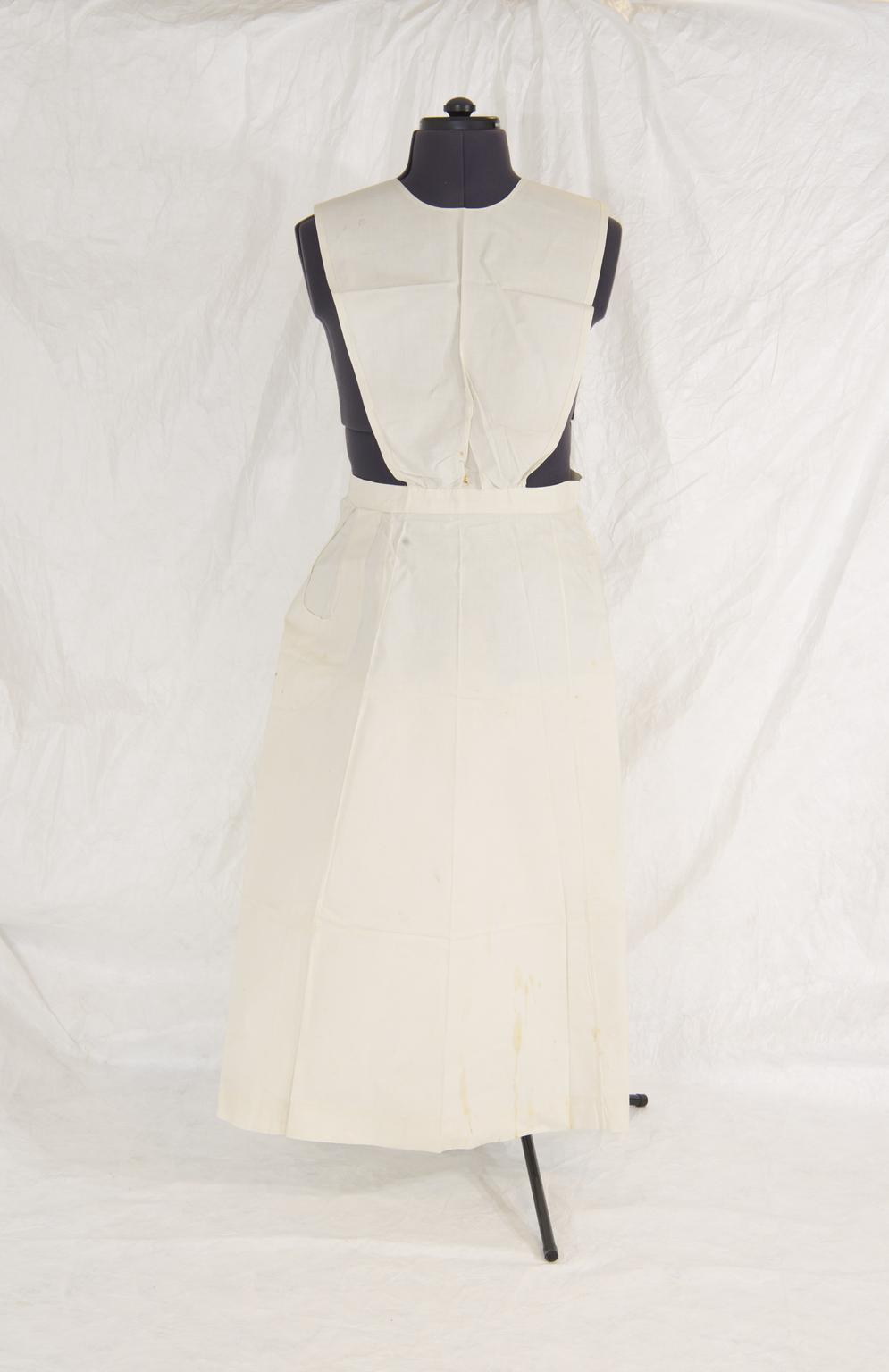 Plain white cotton round bib apron with cross straps, worn by Kathleen Herrick, a Red Cross nurse in France, 1915
