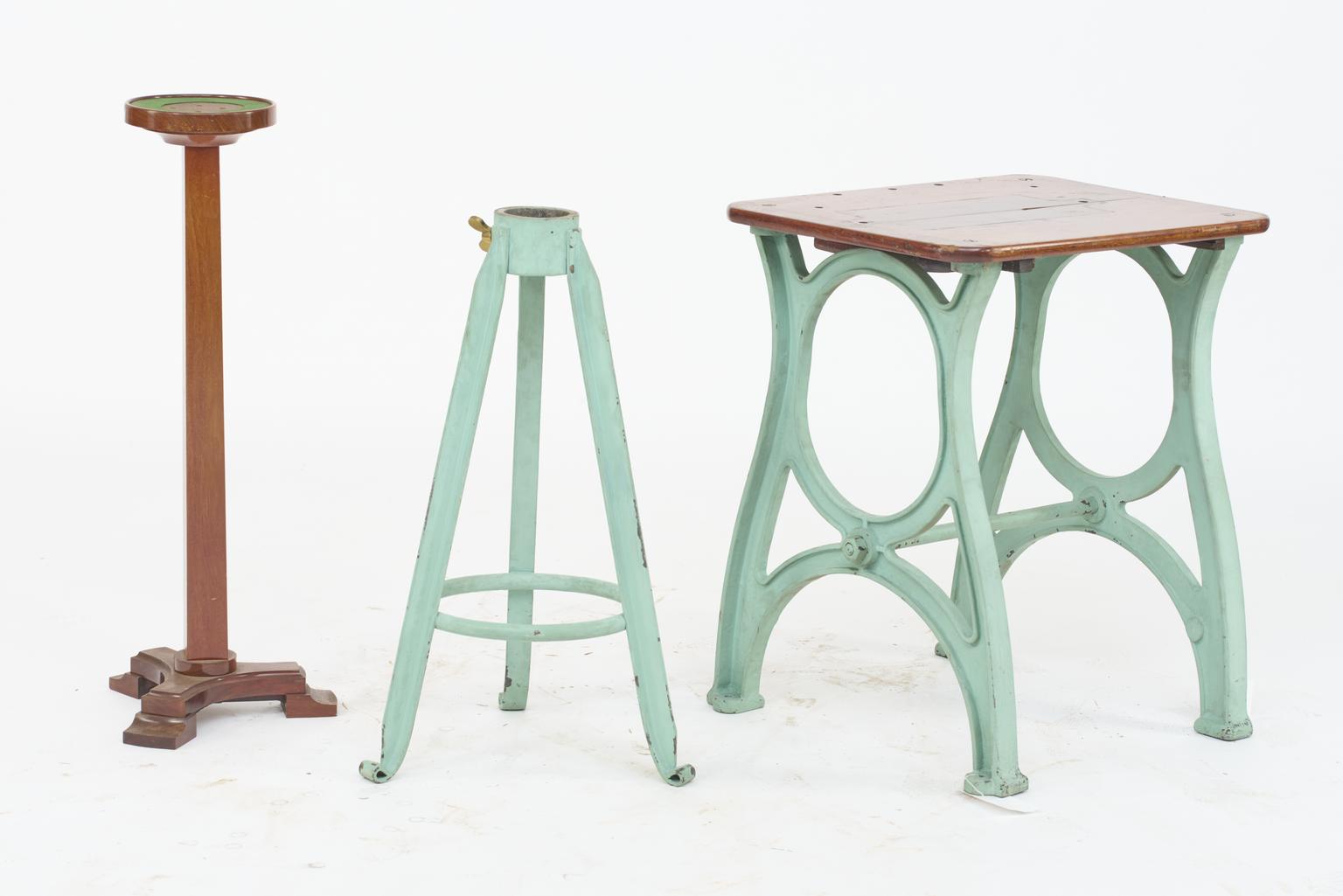 Components from Louis Cailletet's apparatus for the liquefaction of oxygen, 1887, pump, metal holder with two clamps, flat metal three-legged stand, and circular wooden holder with curved metal arm; steel cylinder with hexagonal top; two metal cylinders, one grey and one brass-coloured with a flared top; and a metal pole