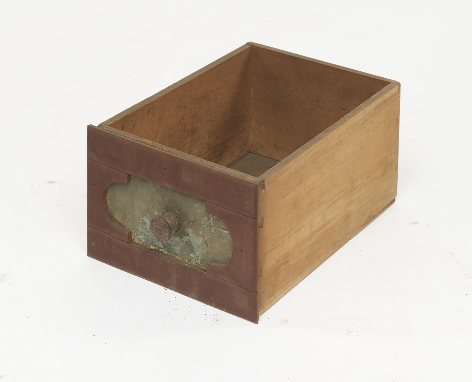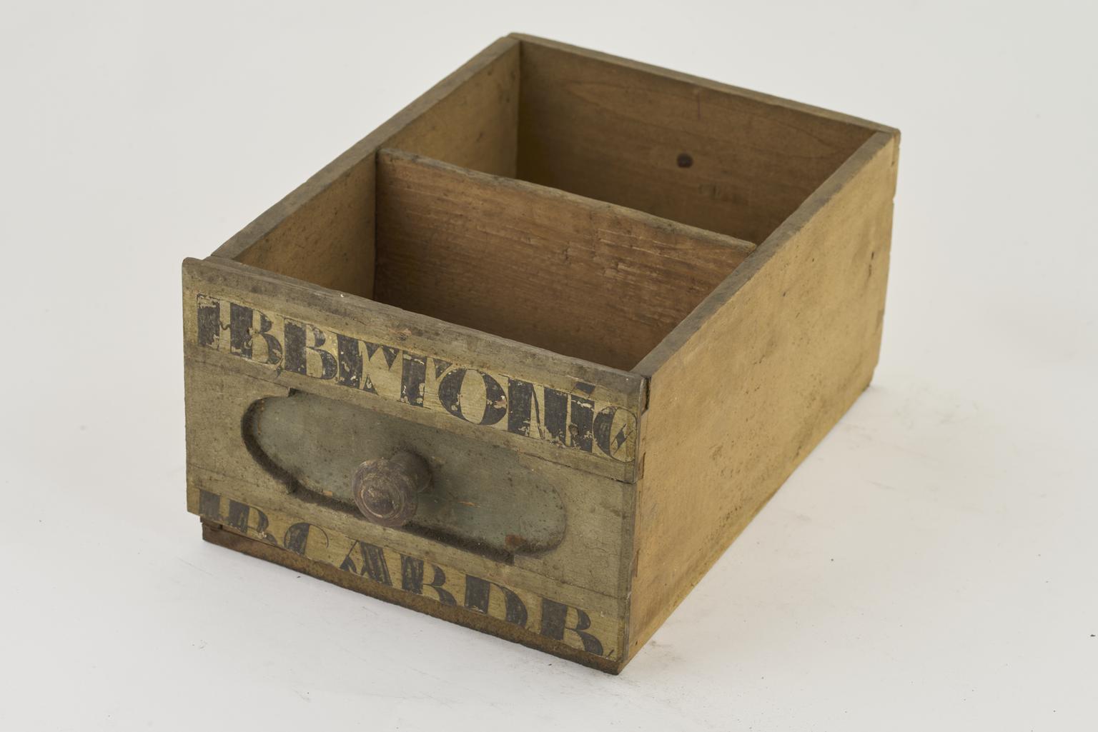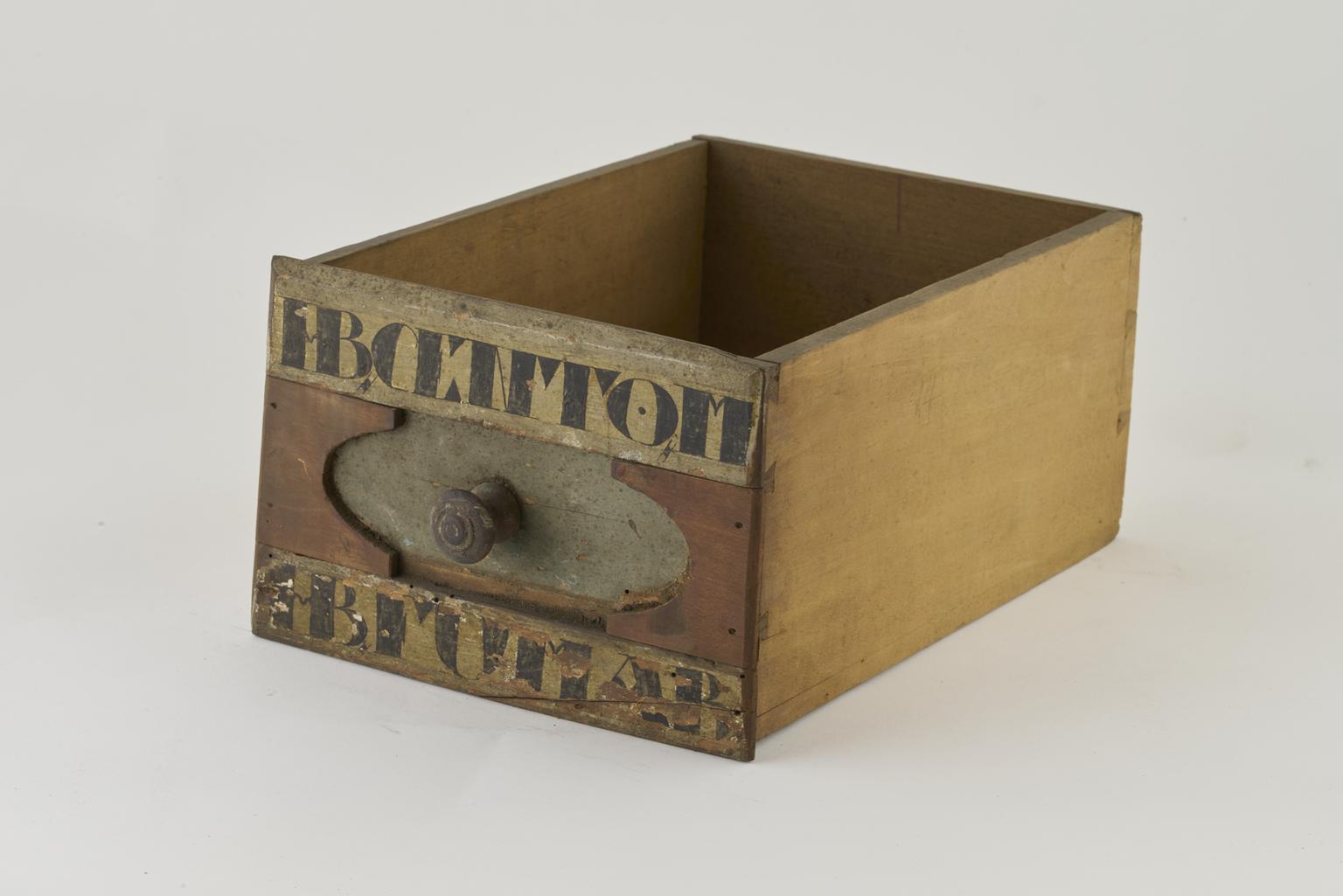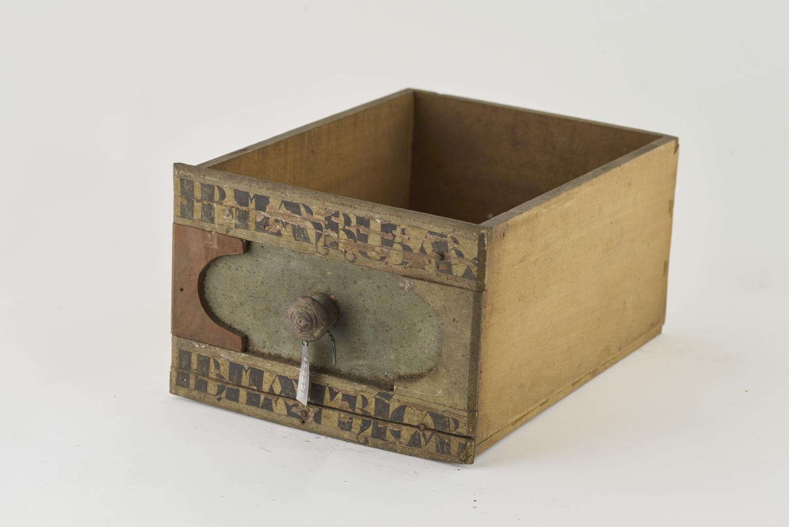 Wooden drawer witth only one painted label, the other is missing