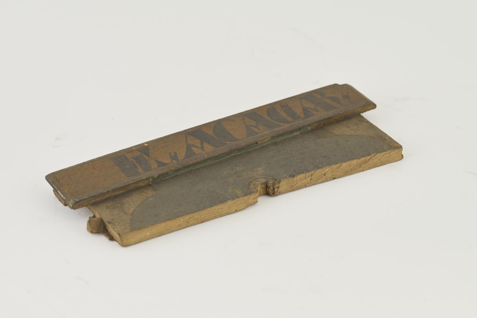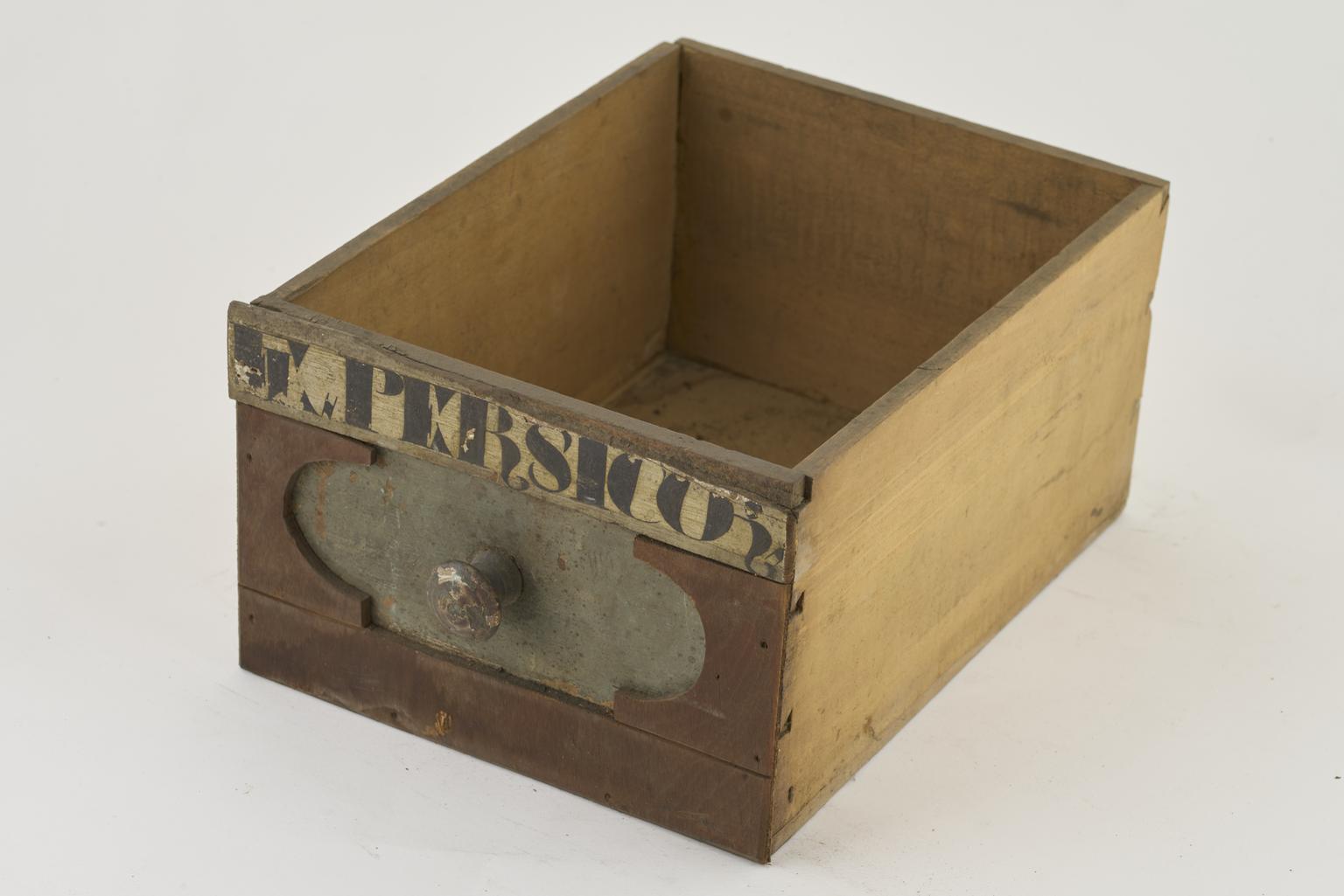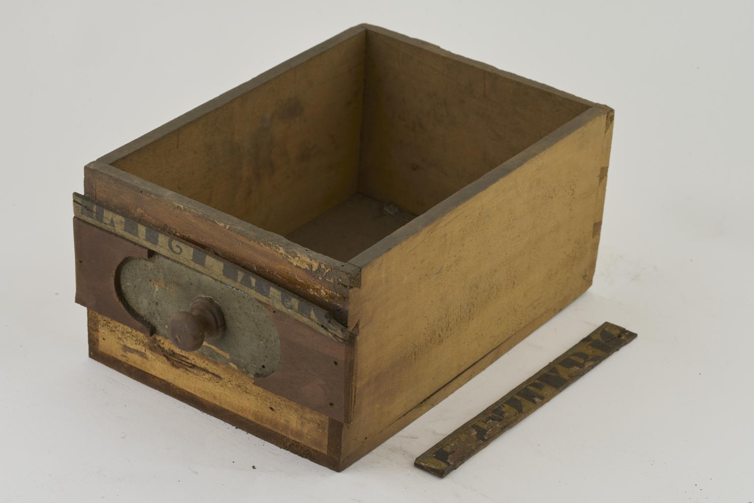Part of wooden drawer with painted label