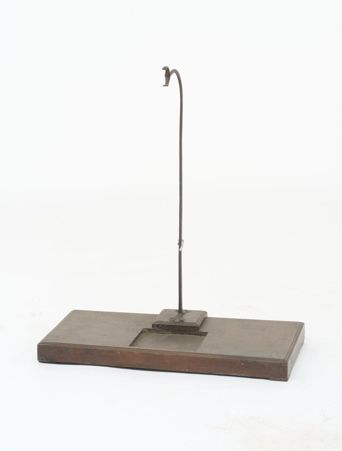 Stand for scales, European, 1701-1800. Woodden base and upright metal support with fixing for balance..