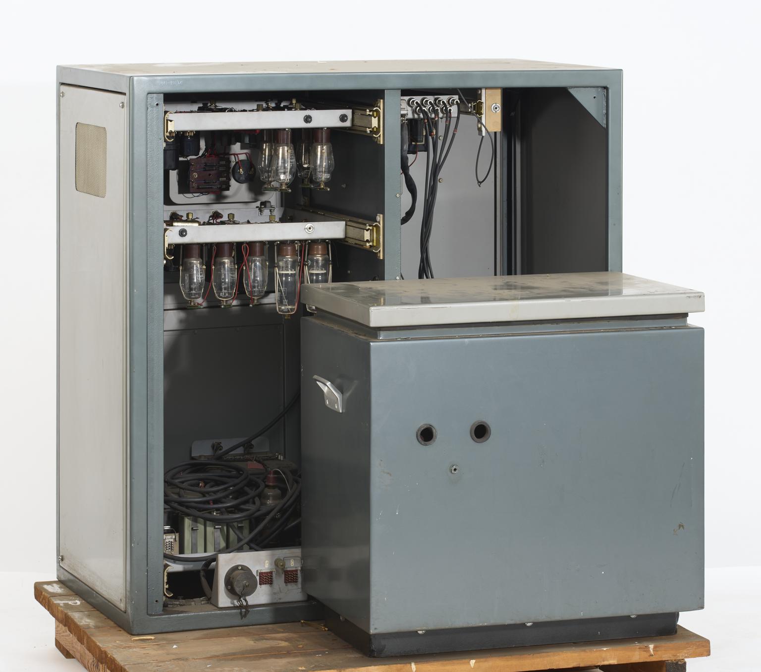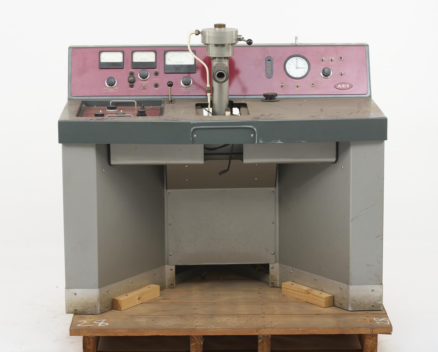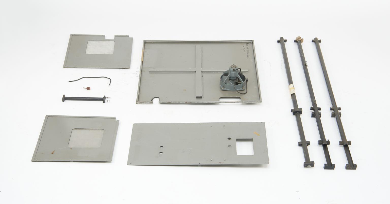 Assorted accessories from ED2 Electron diffraction instrument. Include in the accessories are: a length of heavy duty electrical cables coated in black rubber. A top camera column and a bottom camera column. Two pyramid stands, one made of brown wood with two metal pipes coming through the top, the other is a grey metal stand with a semi-circle latch and holder at the top. One vaccum goutiol chassis with a wiring system at the back. Two metal sheets and one wooden sheet with a green felt fabric attached at the top. A metal plate holder. A box with vaccum connection metal pipes, metal plates, a glass valve, a plate indicator cover, a glass tube, screws, bolts, and other additional metal components.