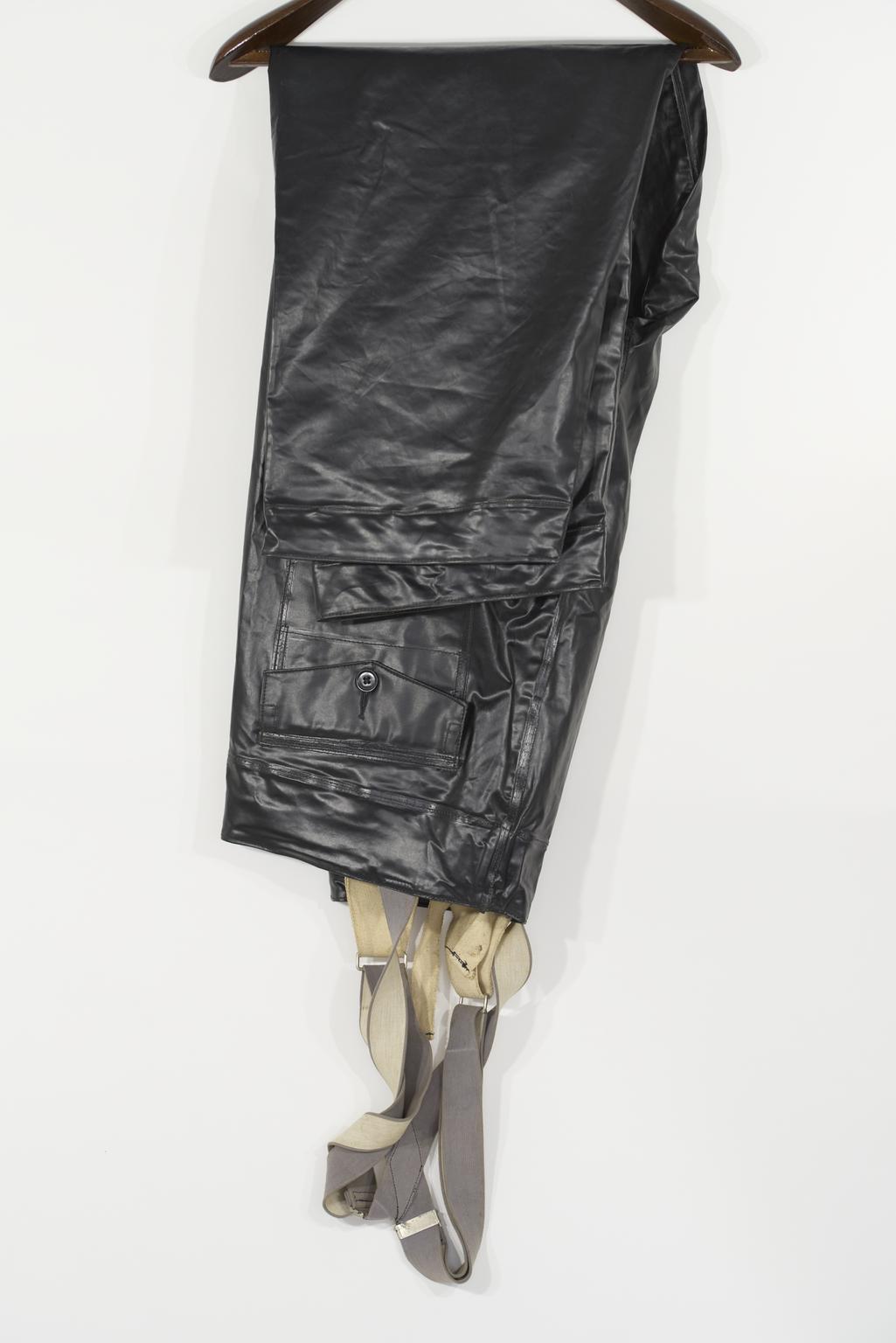 Royal Navy foulweather trousers in black pvc, as used in the 1950s and 1960s ( now obsolete)