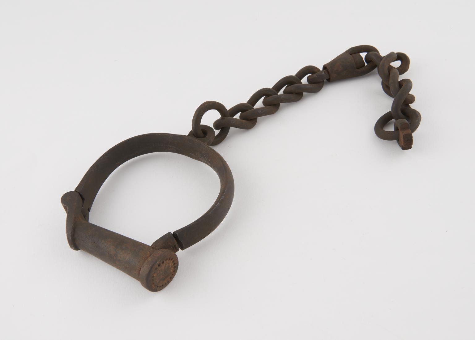 One leg iron, in the form of a rusted iron circular cuff connected to a thick link chain.