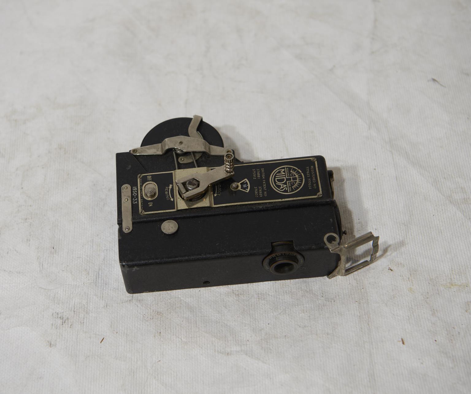The Midas camera/projctor was shown at the British Industries Fair in February and March 1934 and originally cost seven guineas. When used as a camera it took 30 feet (9.1m) of 9.5mm film in circular magazines. A small electric motor, could be attached, otherwise it was hand cranked. The processed films could be projected by the same mechanism but turned by hand, and a built-in electric lamp provided the light when the machine was connected to a battery.