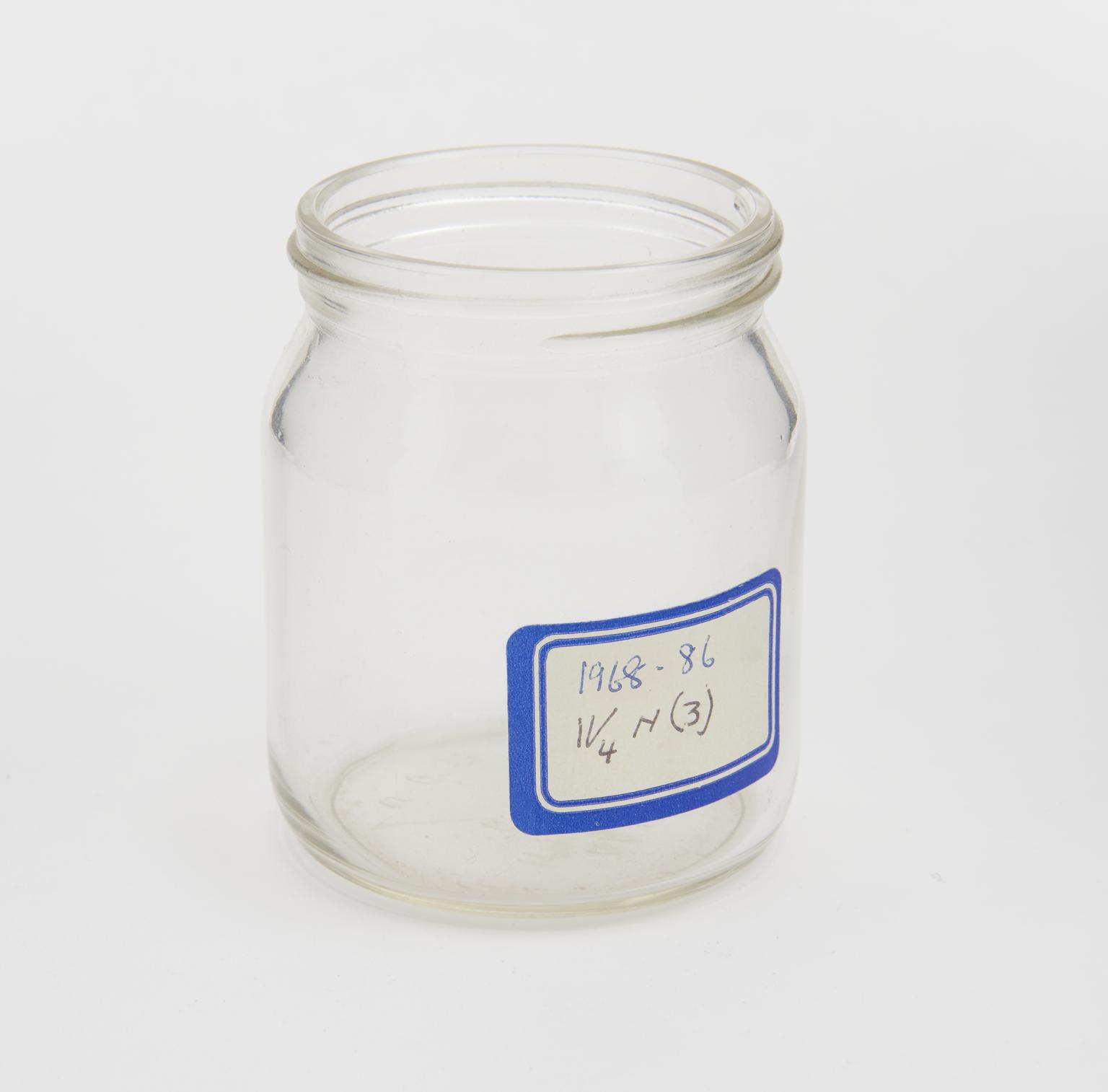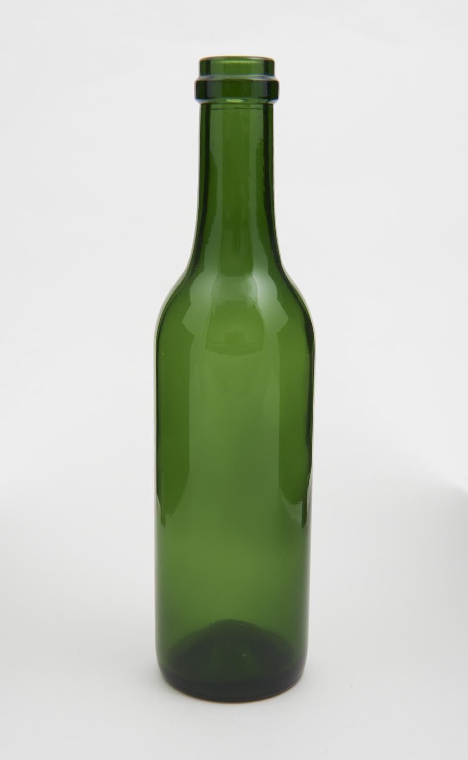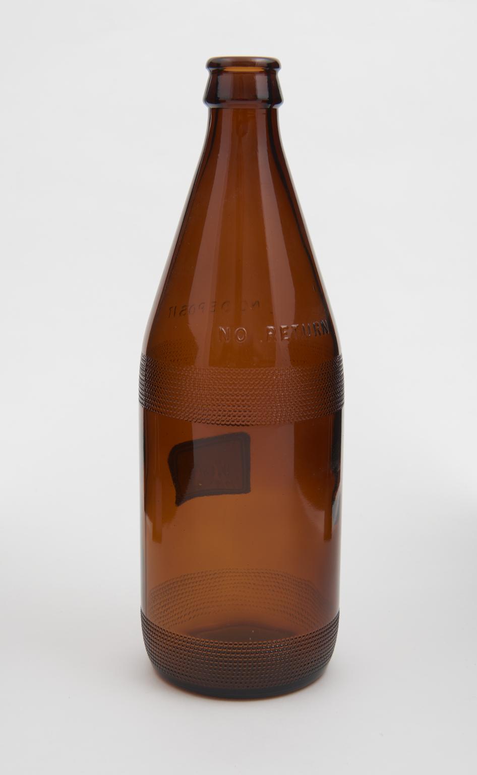 One of nine assorted glass containers. Brown glass bottle, "no deposit, no return" marked on side. "AA196 S 2 UGB" marked on base.