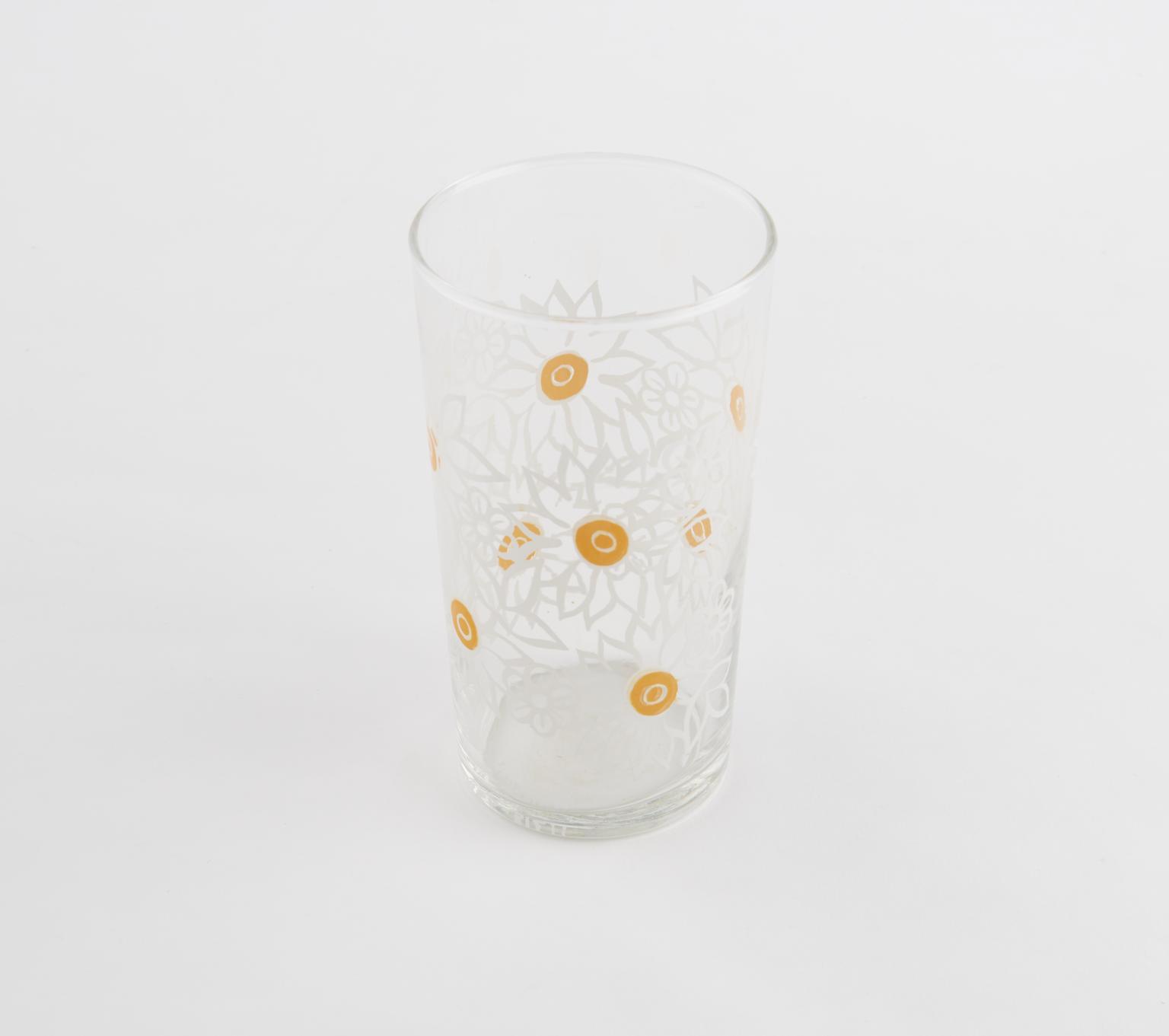 Drinking glass, with transfer enamel decoration with a pattern of white flowers with yellow centres.