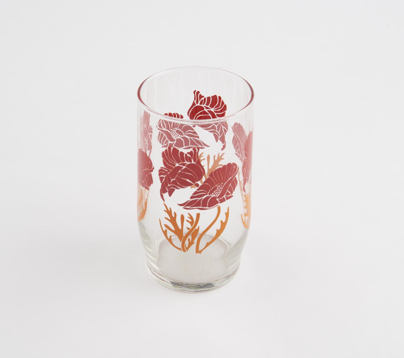 Drinking glass, with transfer enamel decoration with a pattern of red flowers with orange stems and leaves.