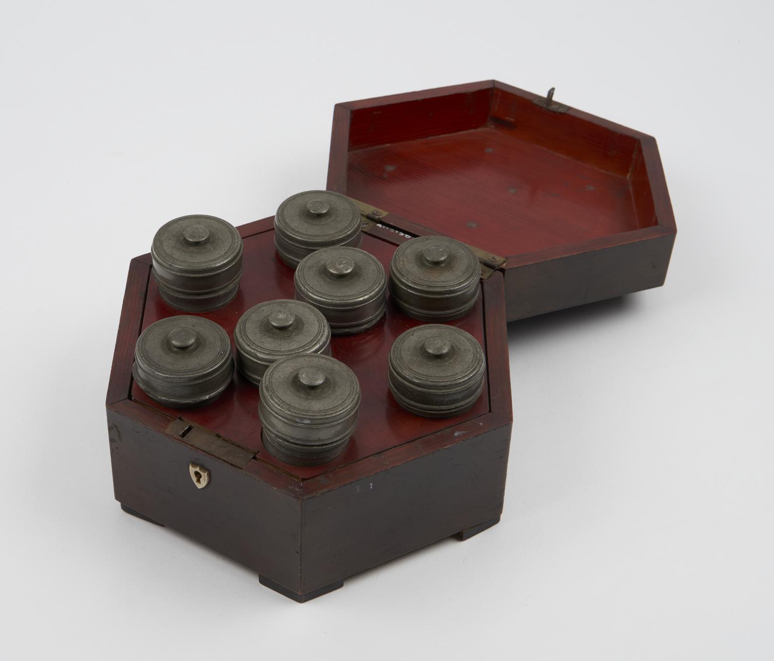 Hexagonal medicine chest containing eight pewter canisters with screw-on lids, European, possibly Austrian, 19th century