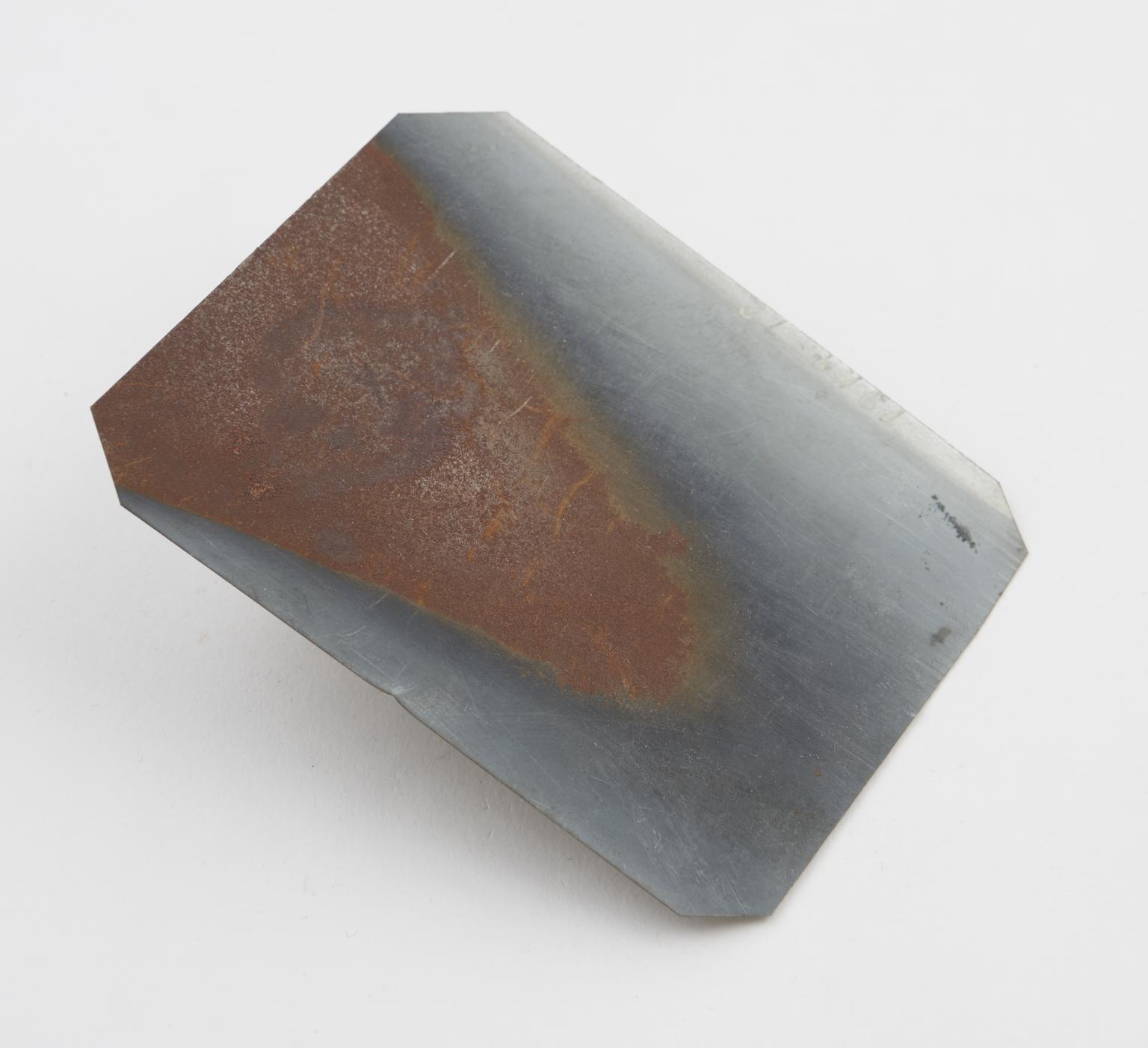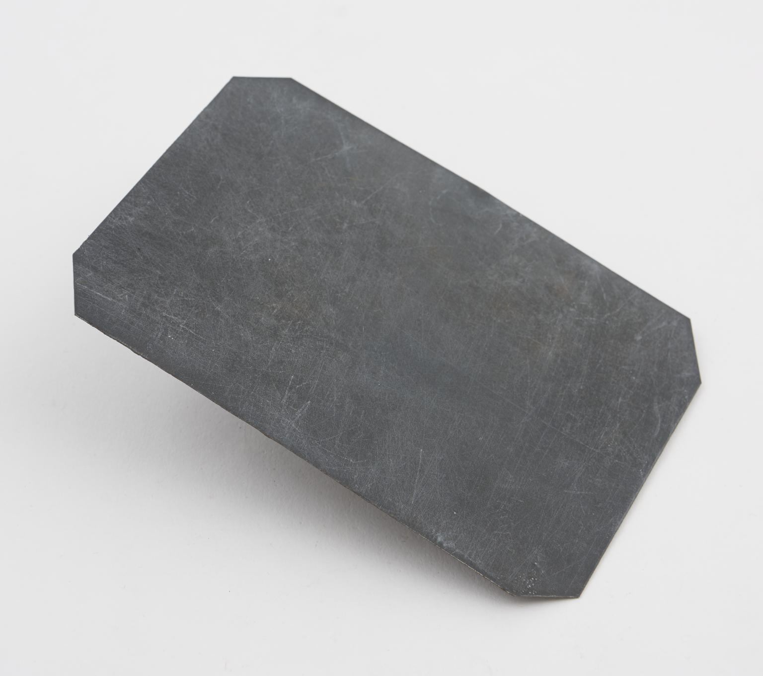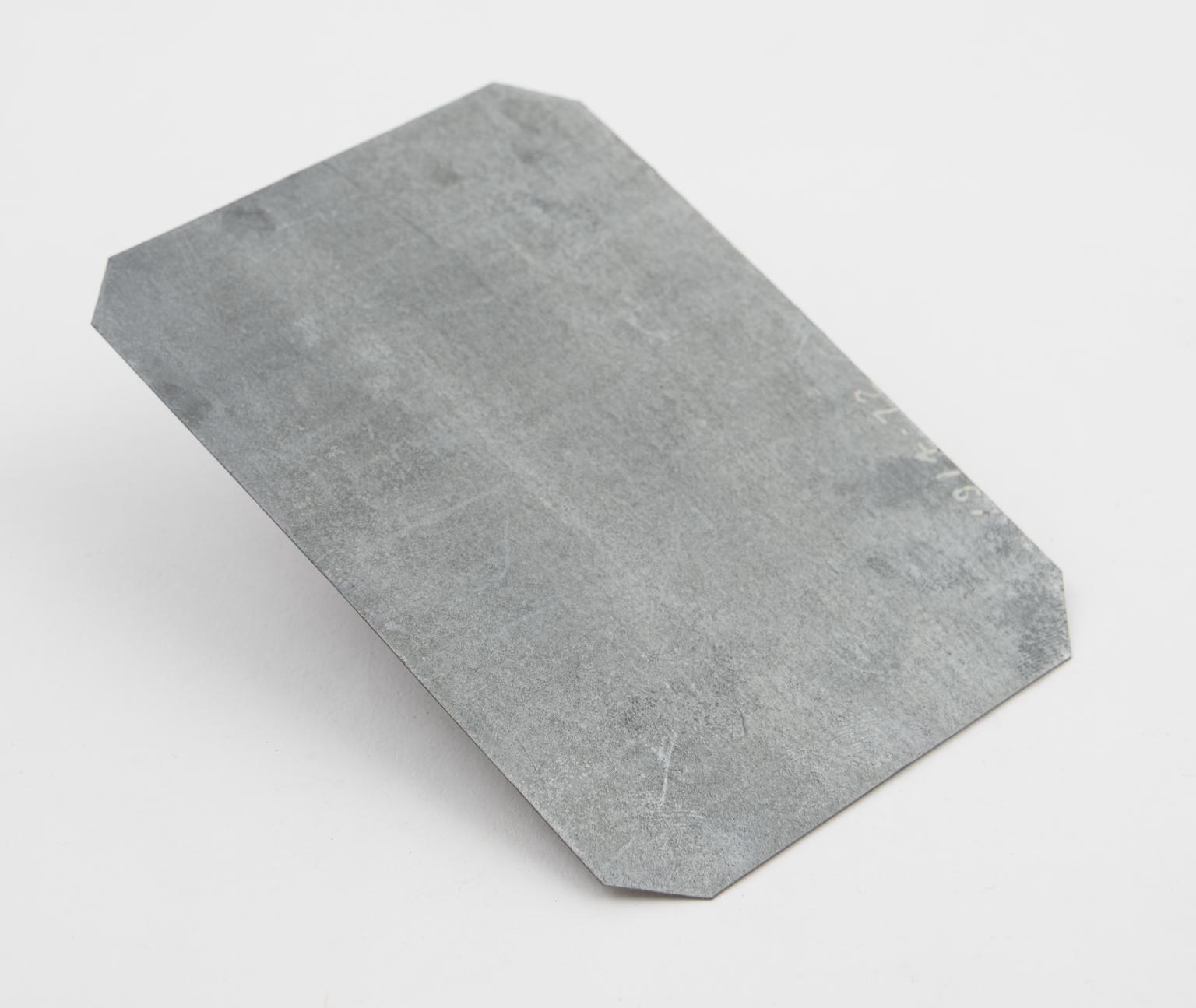 Object illustrating regenerative electro-zincing process, a rectangular panel with angled corners.