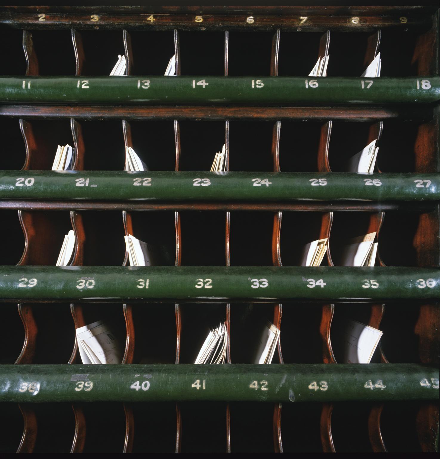 Travelling Post Office (TPO) lineside pick-up apparatus associated with West Coast Joint Stock Railway; includes mailbag exchange equipment (144"x44"x63"); carriage basket (36"x82"x48") and collection post (134" high x 30"x21").