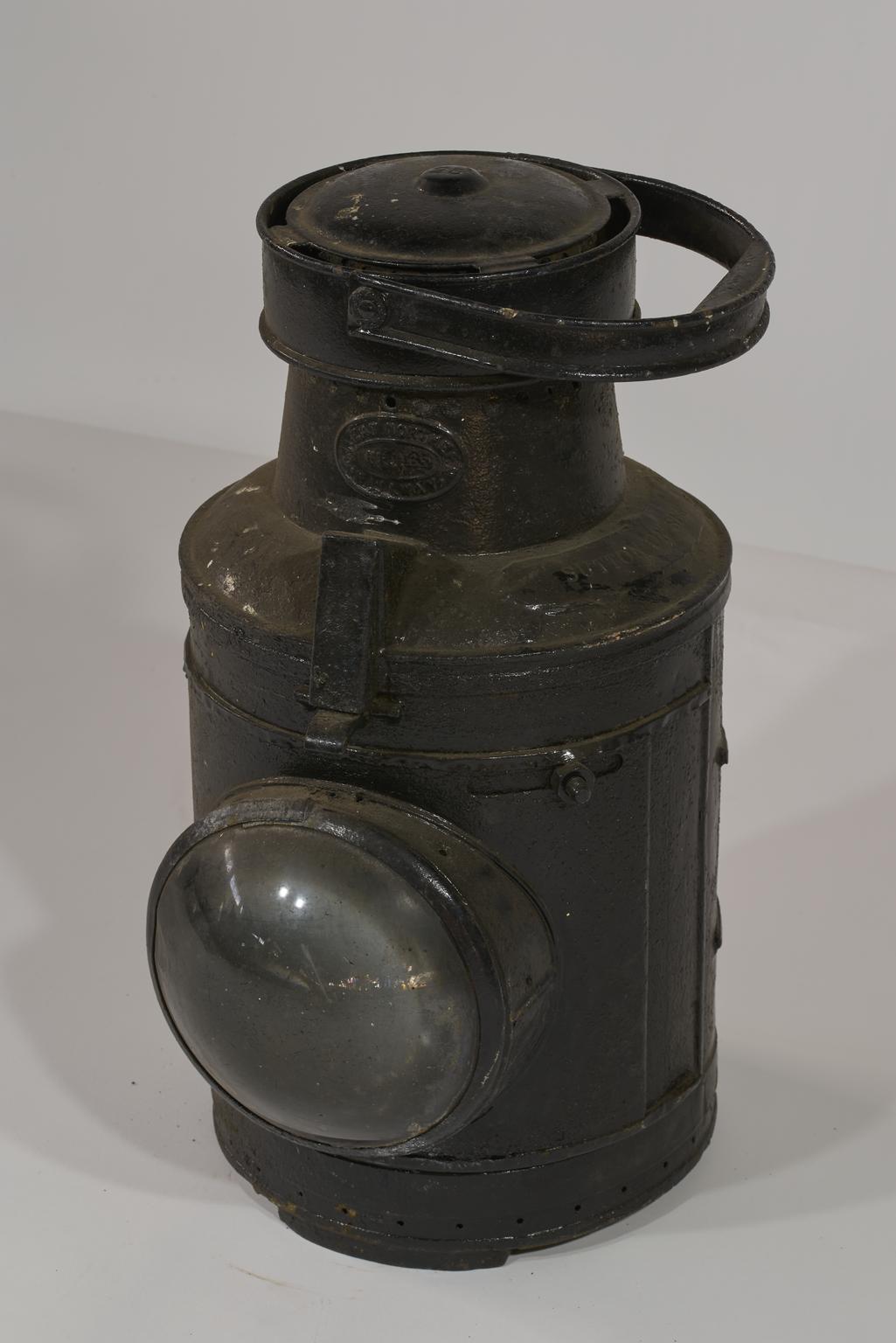 Lattice post, tall square metal framework on square metal base with latticework structure, tapering towards the top and painted black on bottom section and silver on top. Green and red signalling light is affixed near top. Part of Somersault signal, Great Northern Railway.