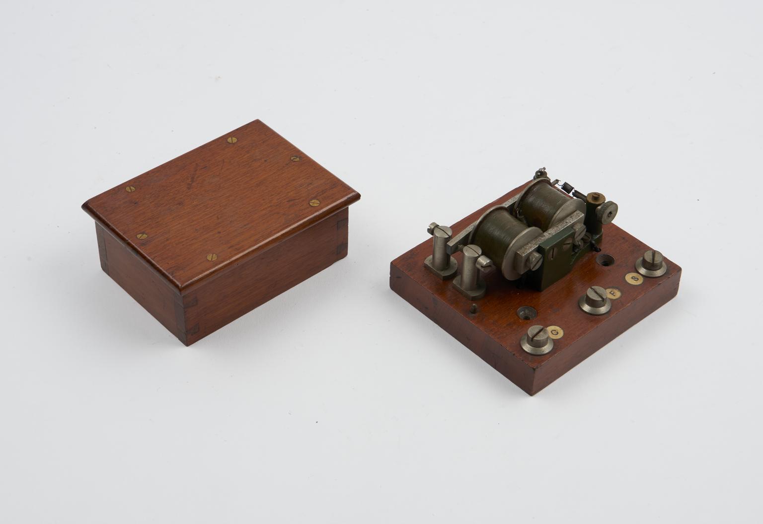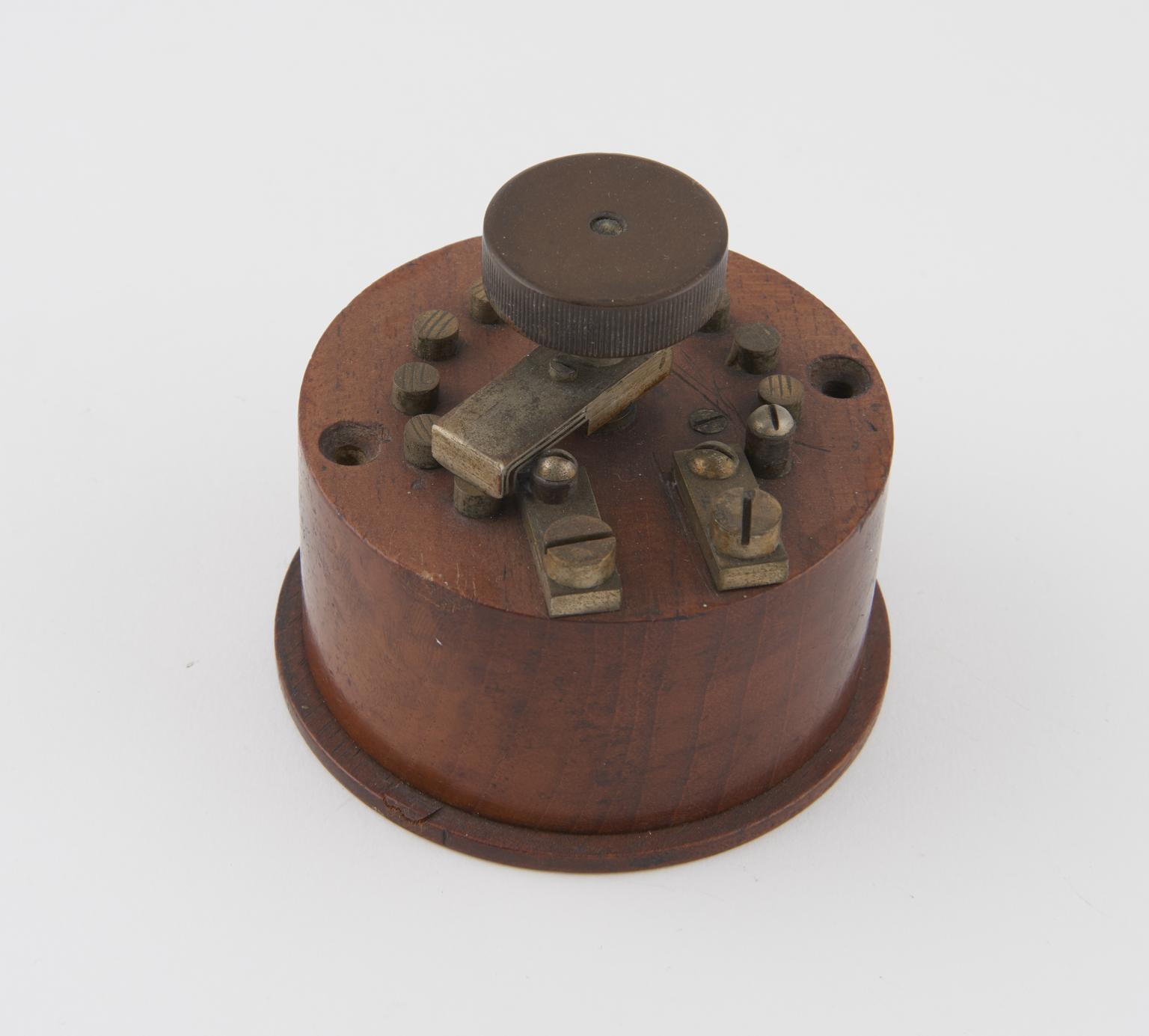 Component of signal key perforator, wood and metal, with detachable lid.