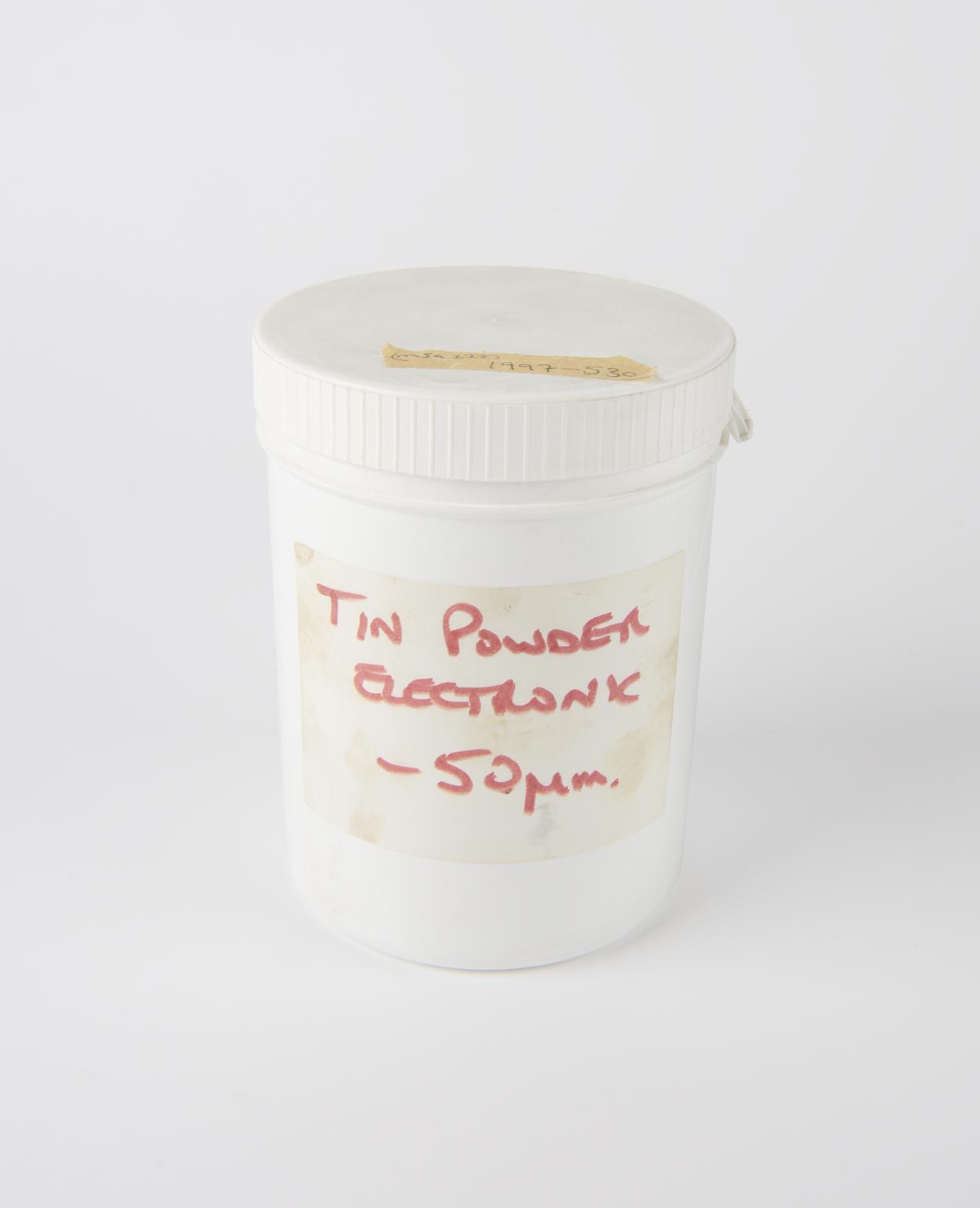 Tin solder powder, electronic grade, 1996. In plastic container