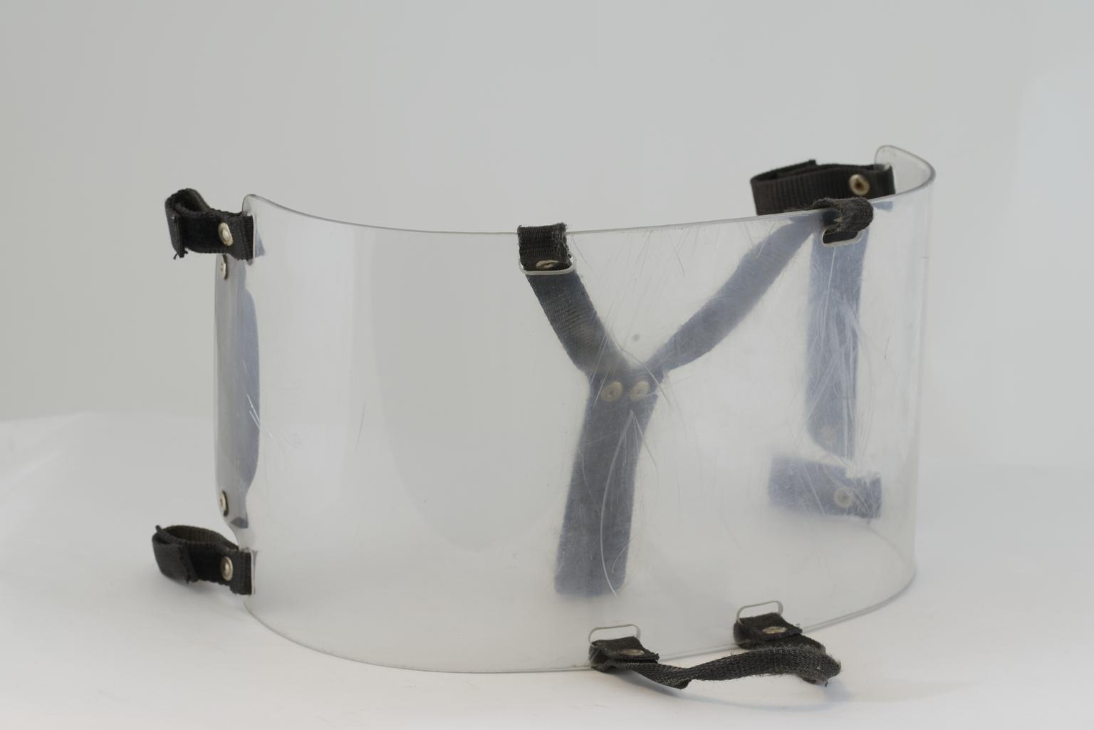 Polycarbonate shield visor from a set of protective equipment for a horse, presented by the Metropolitan Police Stores.