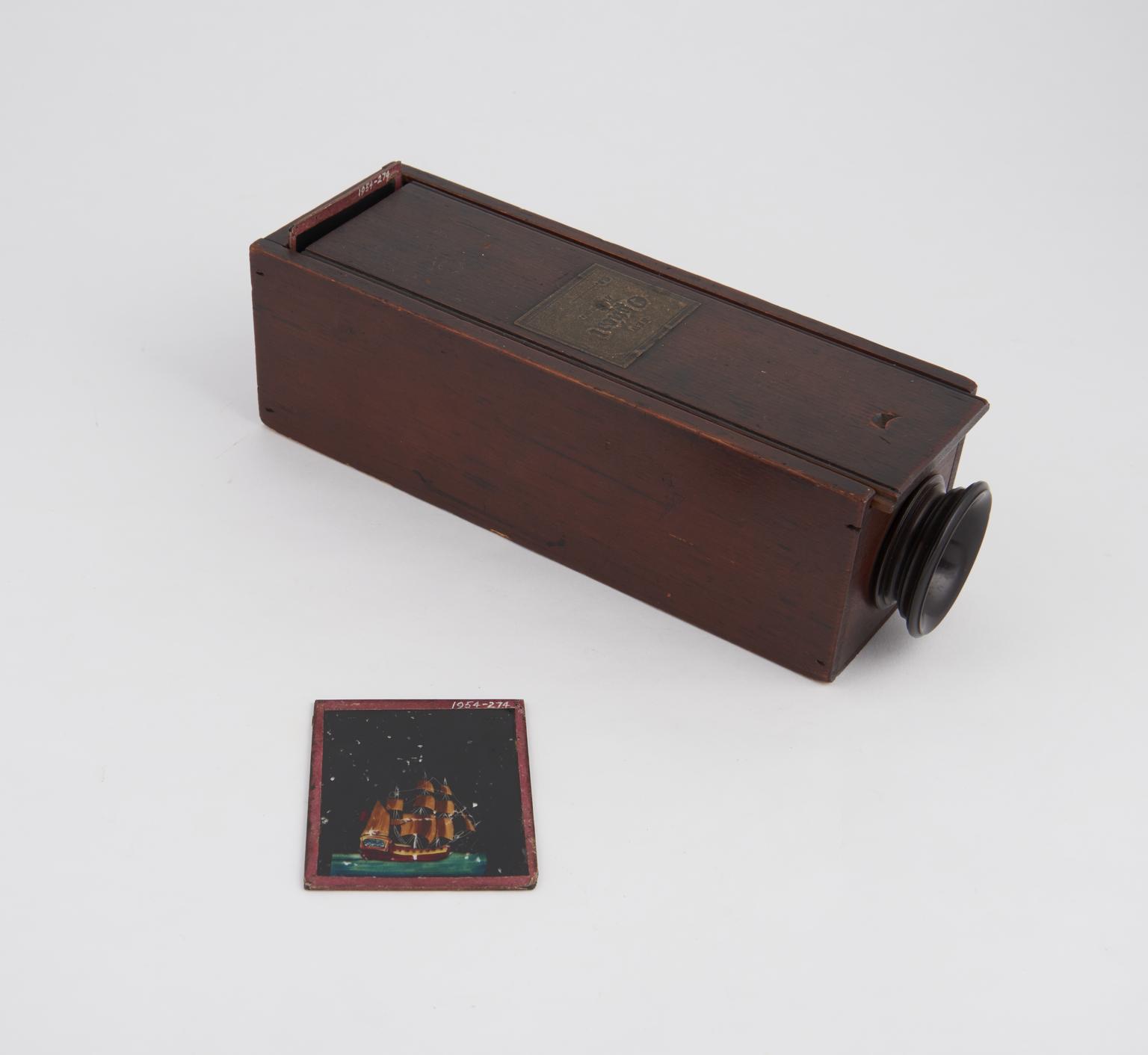 'New Optical Amusements' optical toy consisting of wooden box, with faceted lens at one end capable of rotation, and two coloured glass picture slides for viewing, English, 1795-1805. One glass picture slide is of a peacock, the other is of a sailing ship.