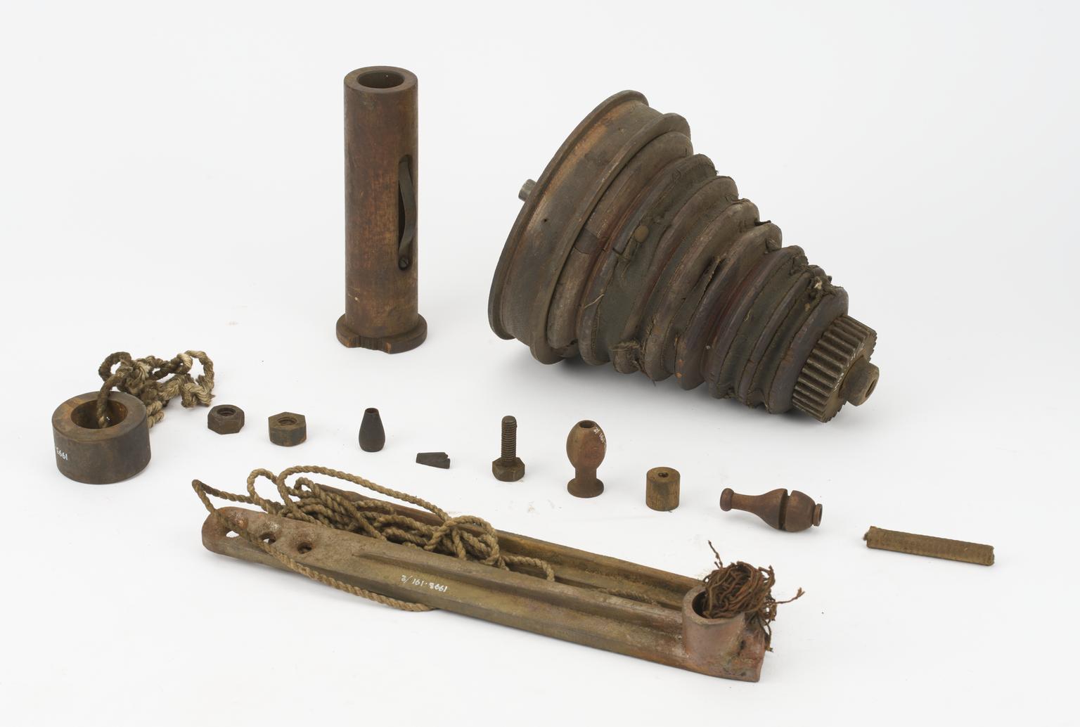 Parts found with 1993-190 and 1993-191 (and may belong) being stepped pulley and metal spur wheel on shaft wooden spool, metal leash, casting (broken)