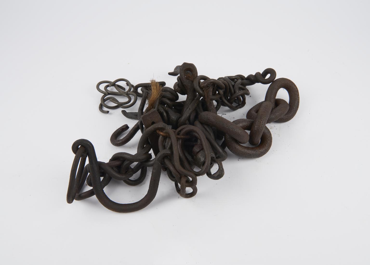 Chain makers Oliver comprising of a block with two anvils, bearing arm, the oliver hammer itself and another fitting of unknown purpose (which may not belong)