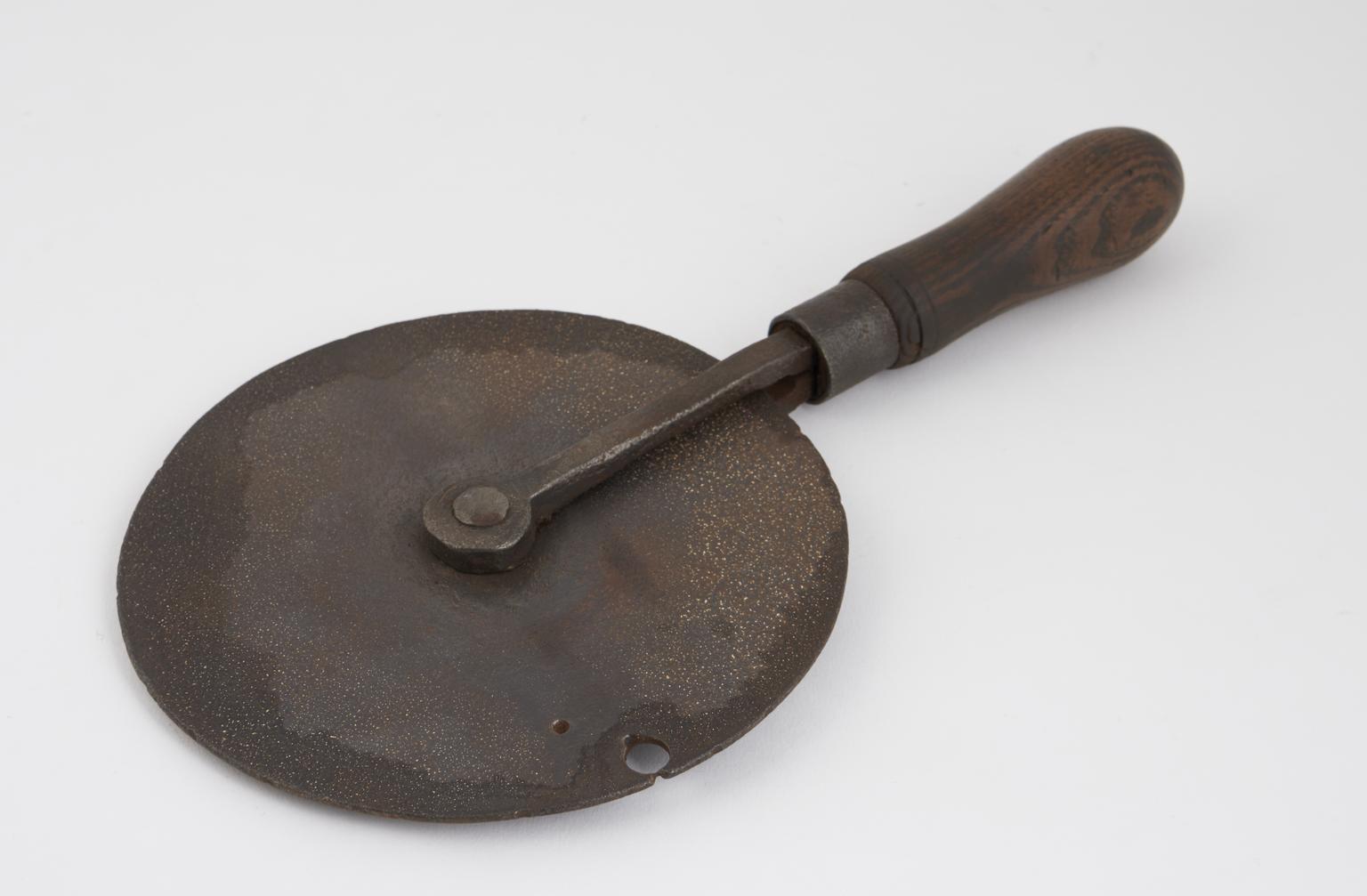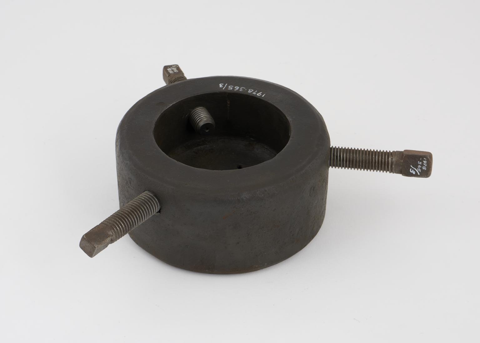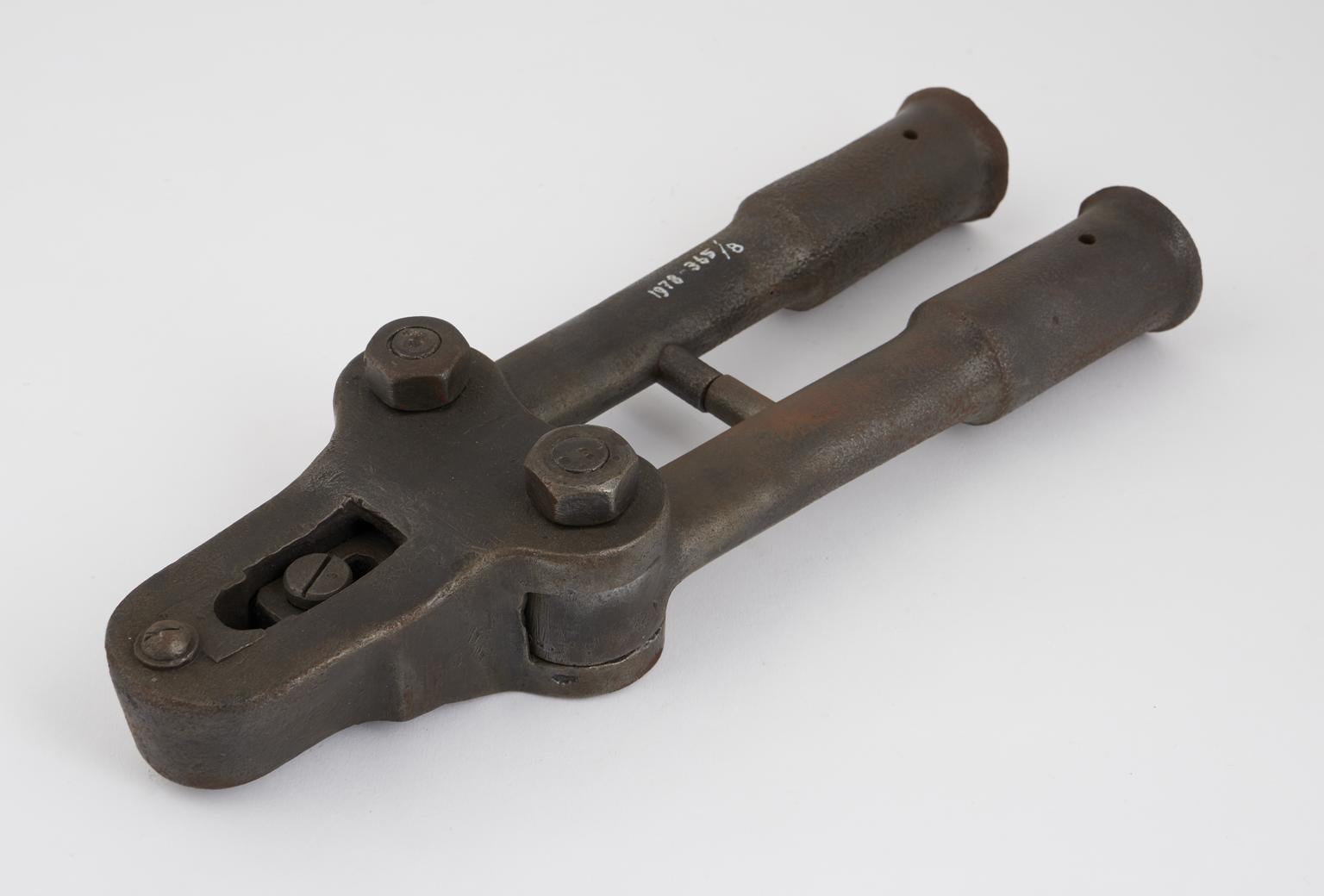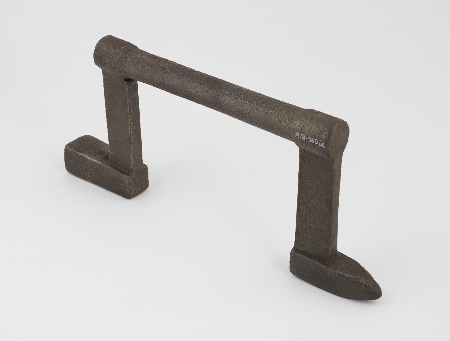 Blacksmith tools and workpieces, related to wheelwright work: 6 strakes, 6 forged bolts, one 3 jaw chuck, one iron brace, one measuring wheel, one pair tongs, one oil can, one pair bolt cutters without handles, two selby patent axle bearings, one hand forged taper borebearing and one forged coach suspension shock absorber