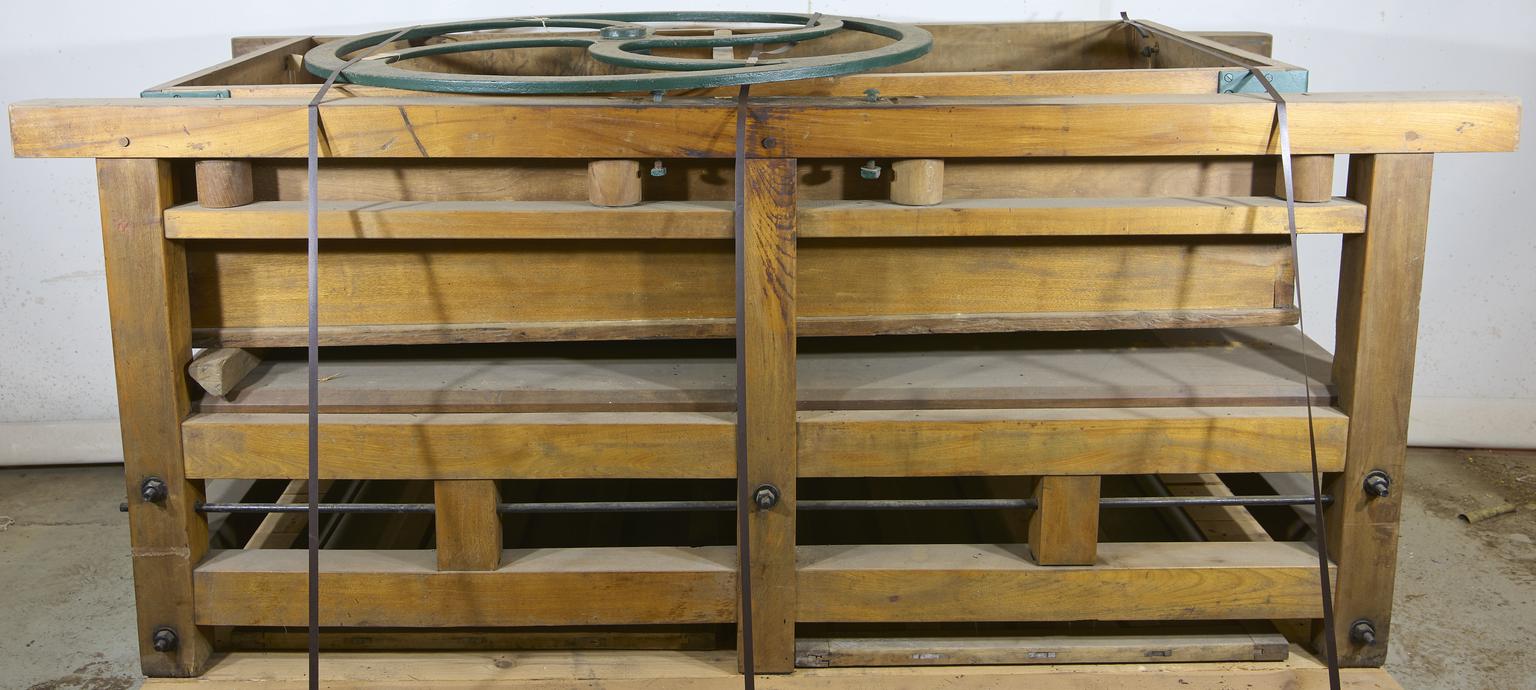 Box mangle, fly wheel, and four wooden rollers, by T. Bradford and Co.