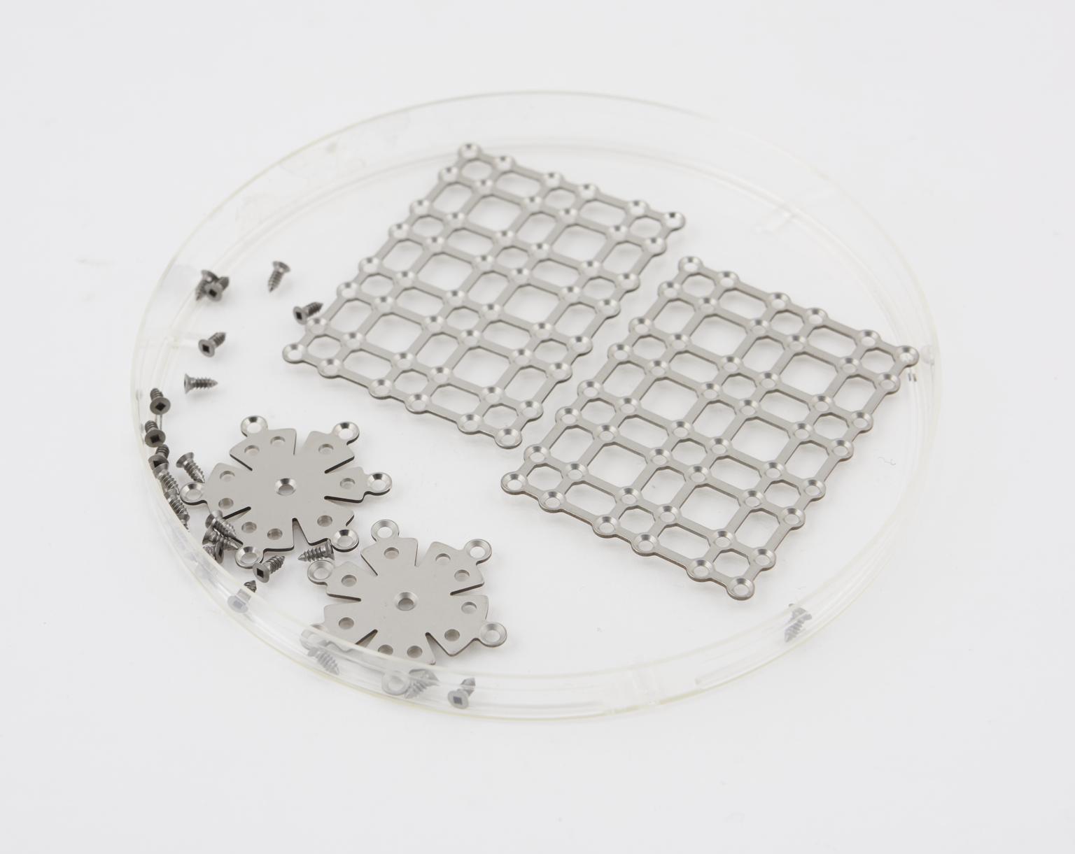 Used for reconstructive surgery of the face, these bone plates, screws and screwdriver are made from an alloy of titanium. The plates are known as bioplates and are used specifically to stabilise the skull. The mesh material can also be manipulated over 3-D shapes.