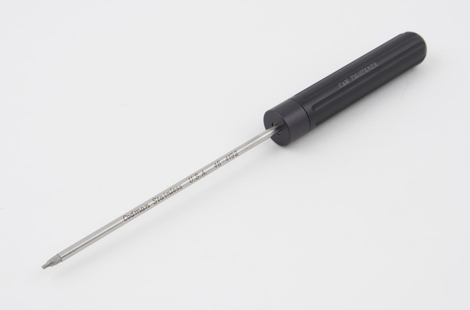 A screwdriver marked 'CAM TIGHTENER' on the handle and 'Codman Stainless U.S.A. 46-4192' on the shaft, by Codman, Johnson & Johnson, United States, 1996. Used for facial reconstruction.