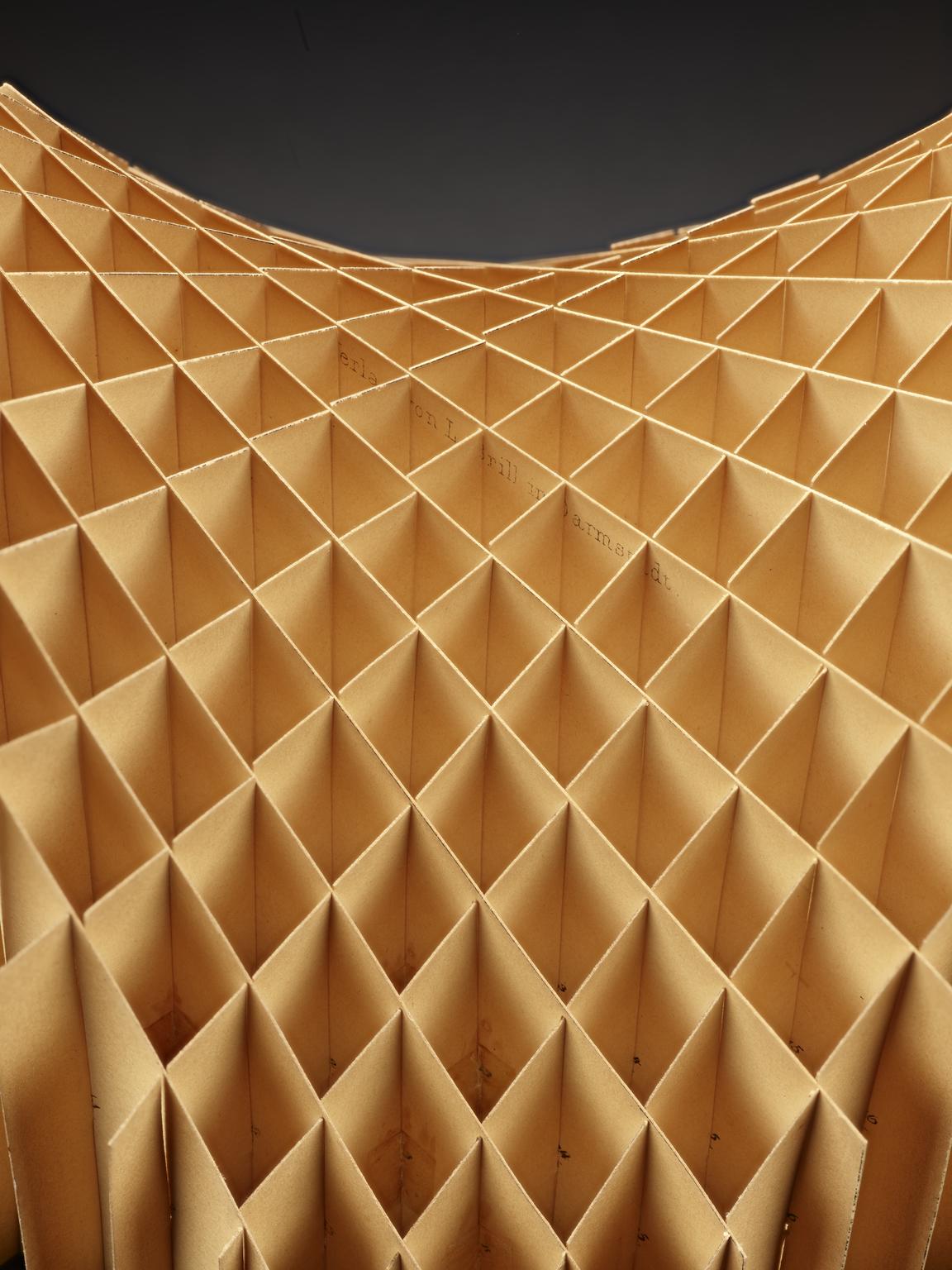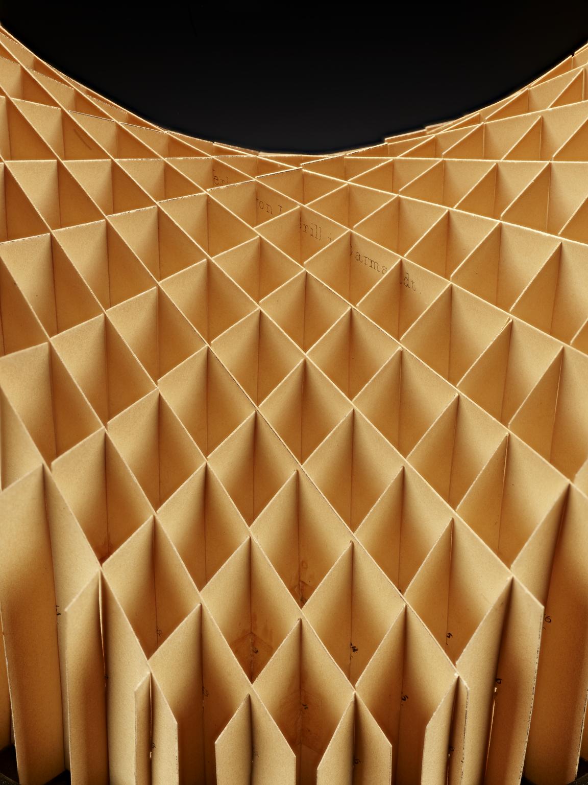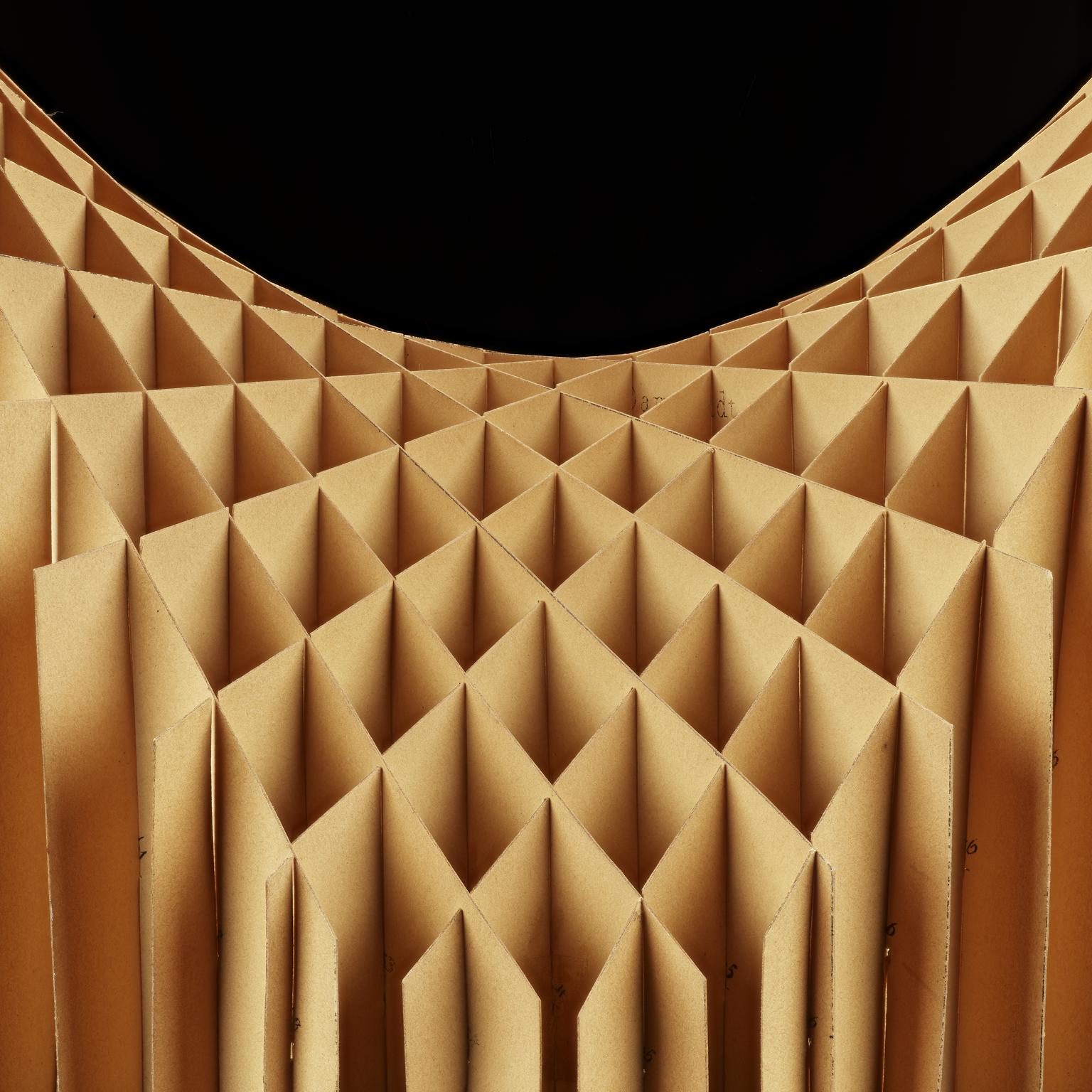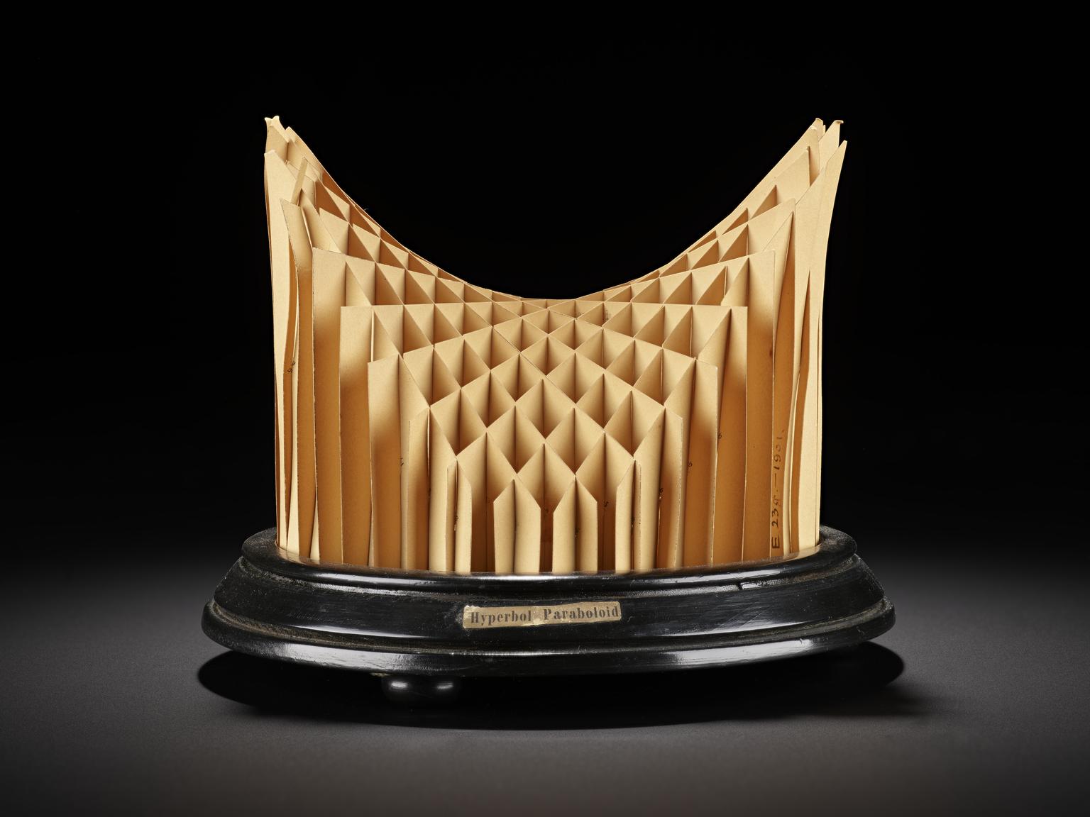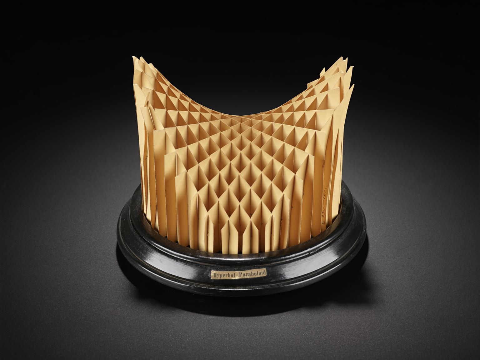Set of 7 assembled cardboard geometrical models on wooden stands showing the following surfaces of the second order: 1) ellipsoid with 22 sections 2) ellipsoid with 30 sections, 3) hyperboloid of 2 sheets, 4) hyperboloid of 1 sheet, 5) paraboloid, 6) hyperbolic paraboloid, 7) cone of two sheets. These cardboard models were made by Martin Schilling at the Munich Workshop set up by Felix Klein (1849-1925) and Alexander von Brill in the 1870s to produce a wide variety of surface models. 'Second Order' means there are squared terms in their equations. This type of model could be distorted into an infinite number of shapes by gentle manipulation. During the late 19th and early 20th century, there was an interest in geometric model making, particularly in Germany.