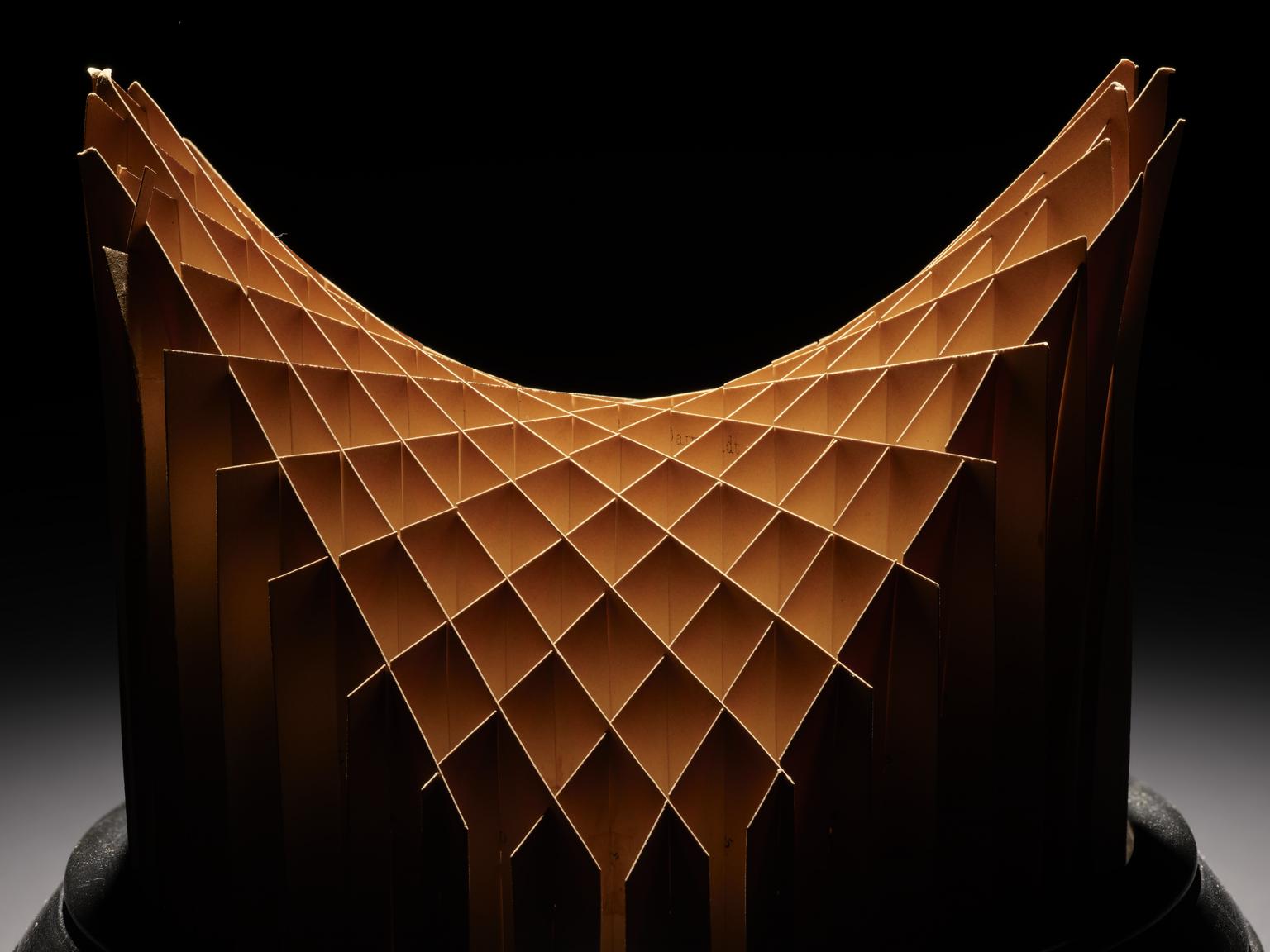 Assembled cardboard geometrical model on wooden display stand [marked 1876-482, not on inventory], showing surfaces of the second order (marked E22c-1901), Hyperboloid of 1 sheet [Einschaliges Hyperbolid].