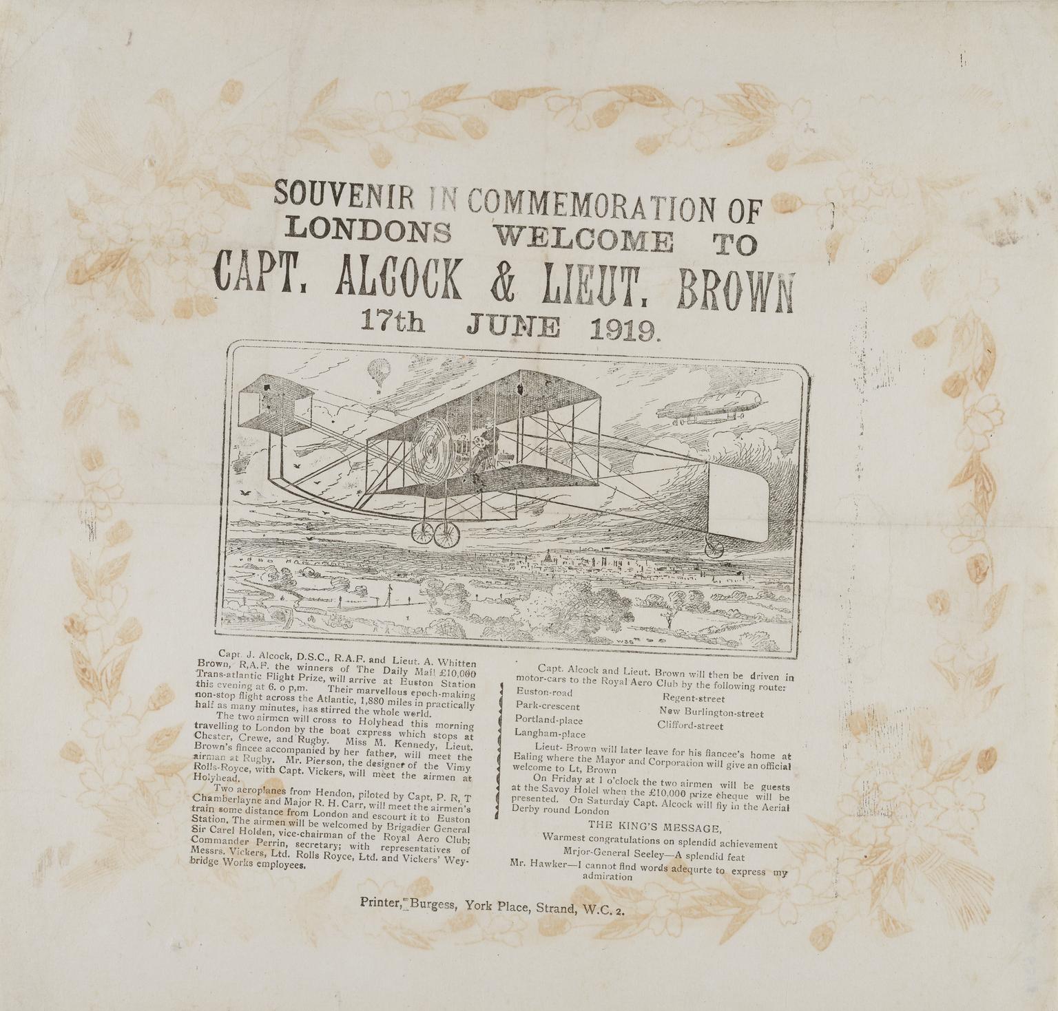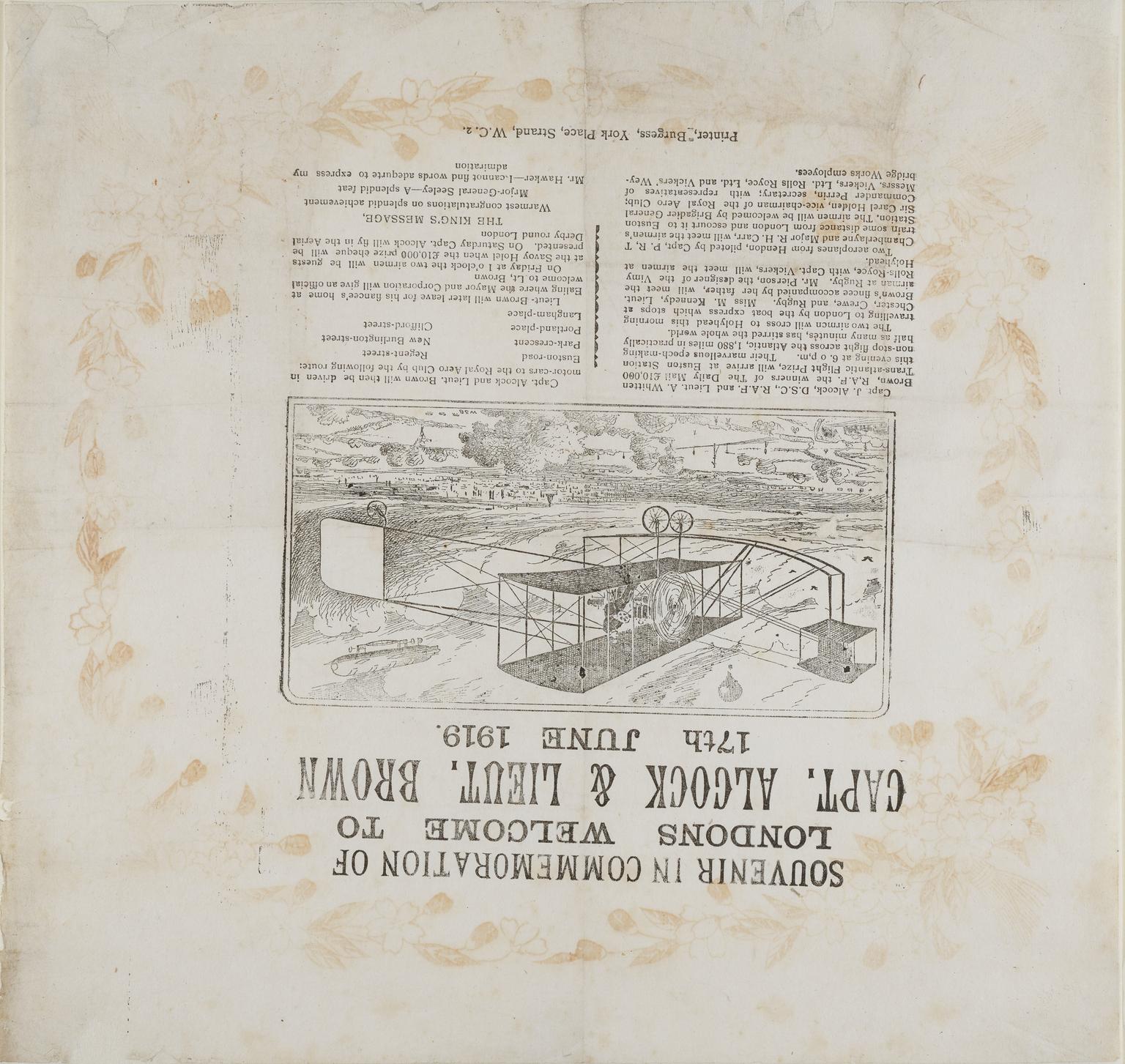Tissue serviette, commemorating the Alcock and Brown transatlantic flight, with the caption 'Souvenir in commemoration of Londons Welcome to Capt. Alcock & Lieut. Brown 17th June 1919.'. The serviette is printed with an image showing an aircraft flying over countryside. Printed by Burgess, York Place, Strand, W.C.2.