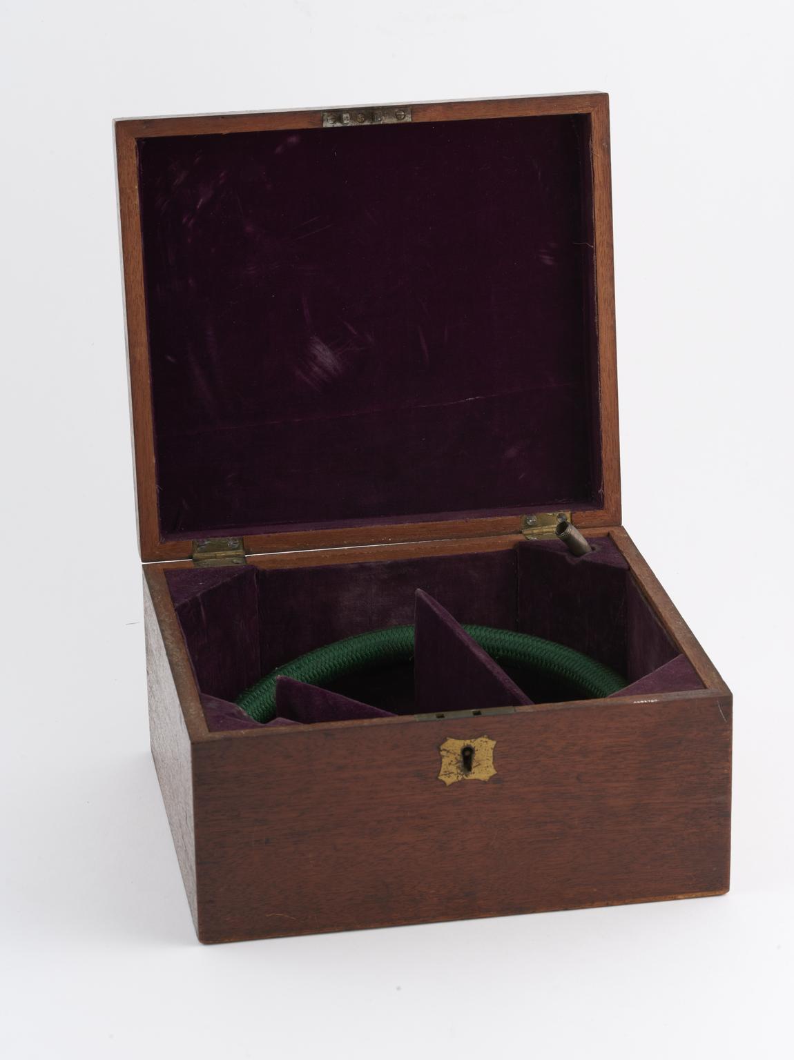 Mahogany box that contains a conversation tube hearing aid, also known as a speaking tube, in parts, European, 1880-1915