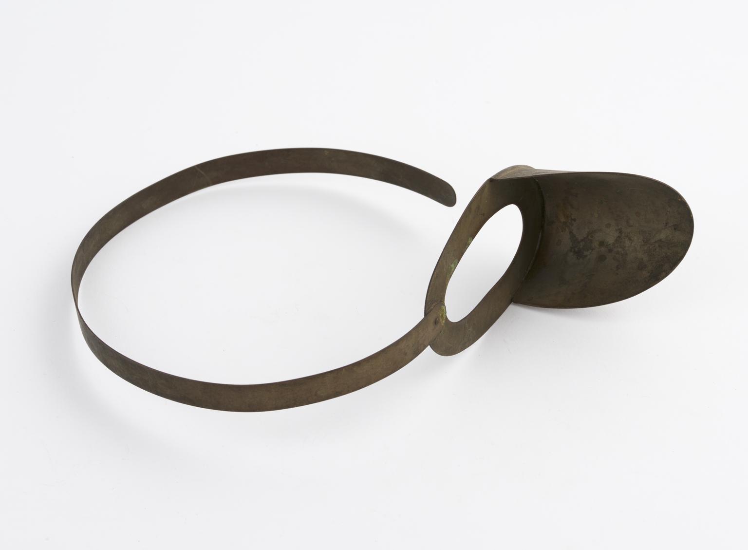 Metal headband associated with boxed parts of a conversation tube hearing aid, also known as a speaking tube, European, 1880-1915.