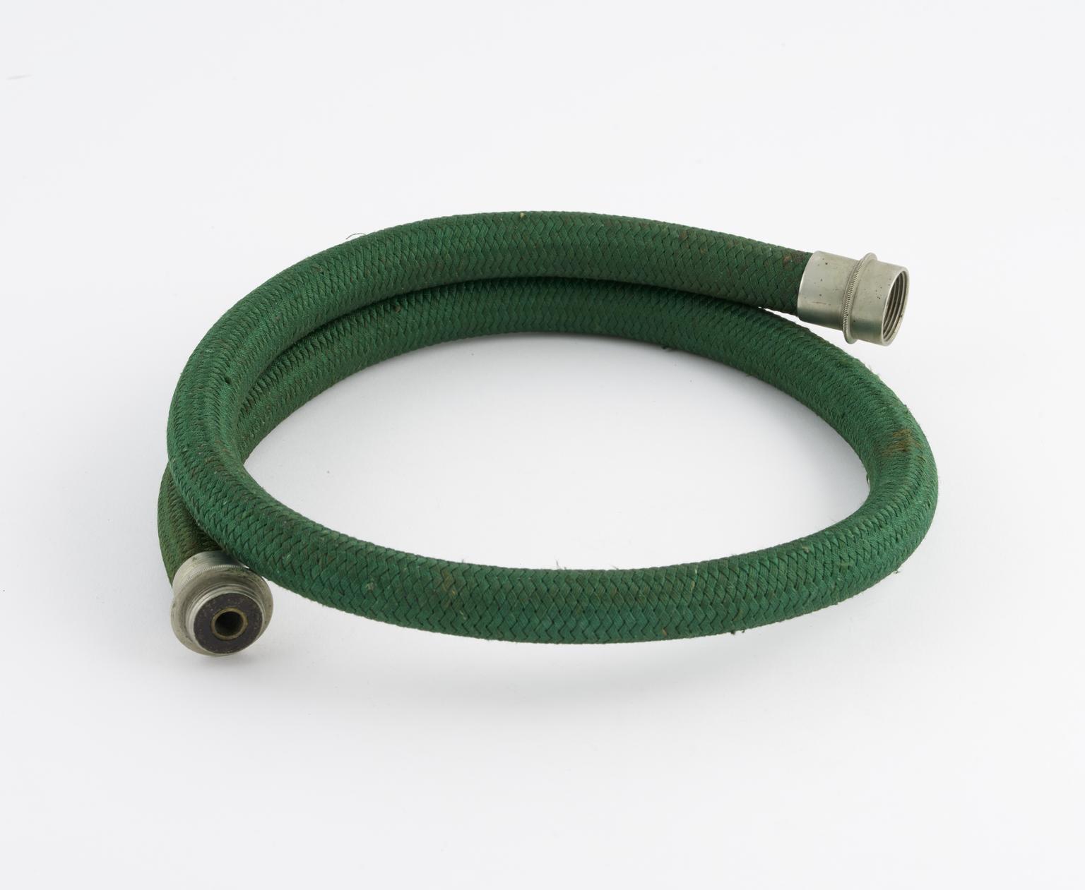 Fabric covered rubberised tube, with metal connectors at either end, part of a conversation tube hearing aid, also known as a speaking tube, European, 1880-1915.