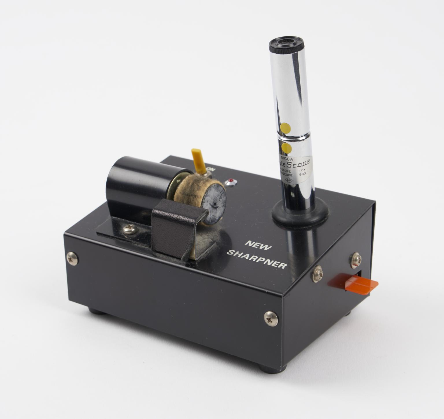 Battery driven 'Style Scope' microscope and needle sharpener, for checking and sharpening the needles used in the Insertion Tube, or Kanshino, method of acupuncture, from the surgery of a British practitioner c.1996, manufactured by Nicca, Japanese, 1980-1985.