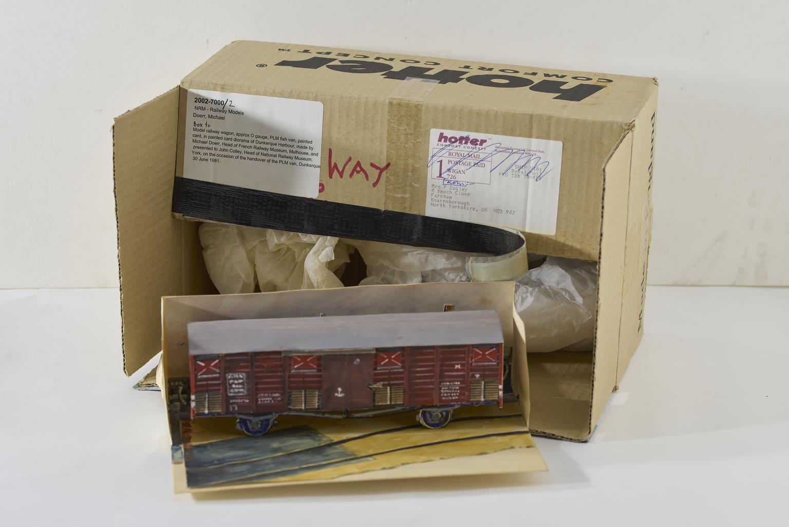 Box to model railway wagon, approx O gauge, PLM fish van, painted card, in painted card diorama of Dunkerque Harbour, made by Michael Doerr, Head of French Railway Museum, Mulhouse, and presented to John Coiley, Head of National Railway Museum, York, on the occasion of the handover of the PLM van, Dunkerque, 30 June 1981.
