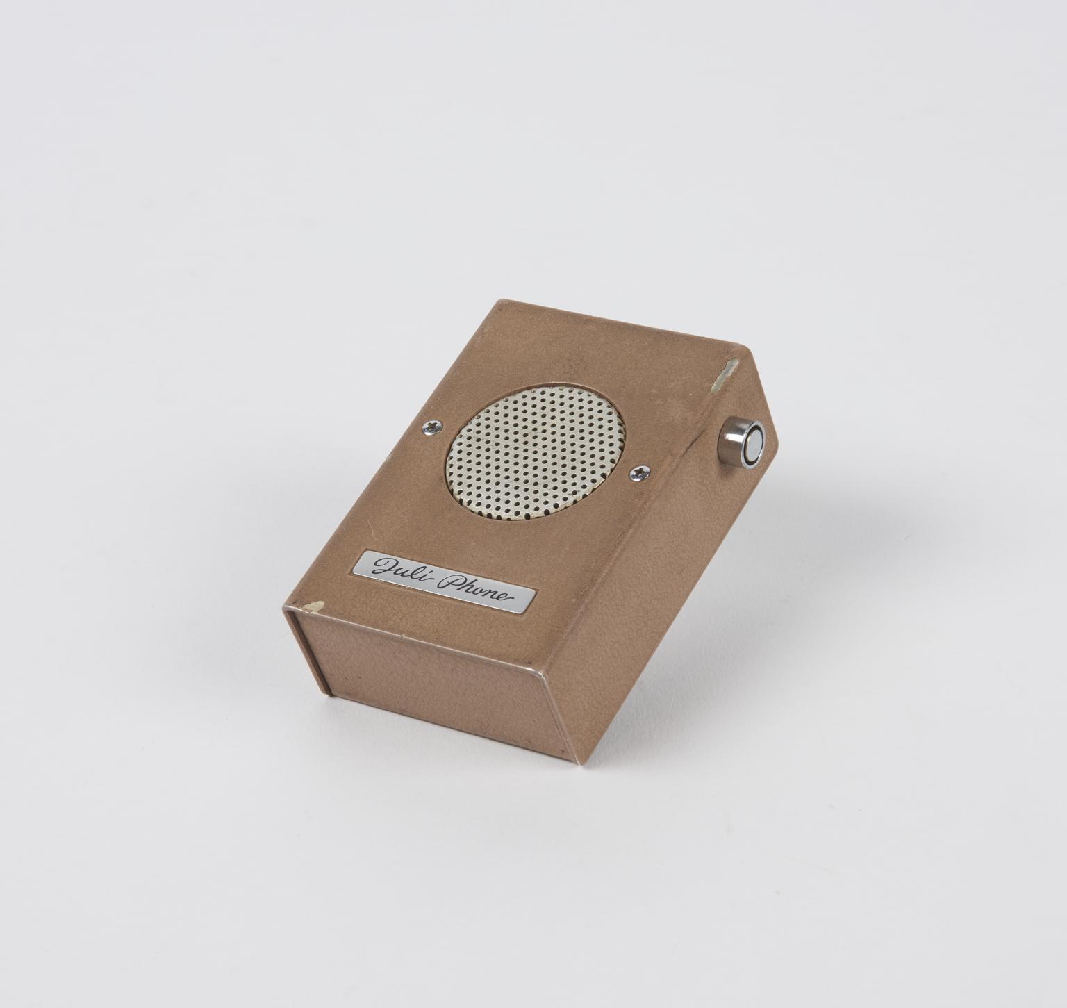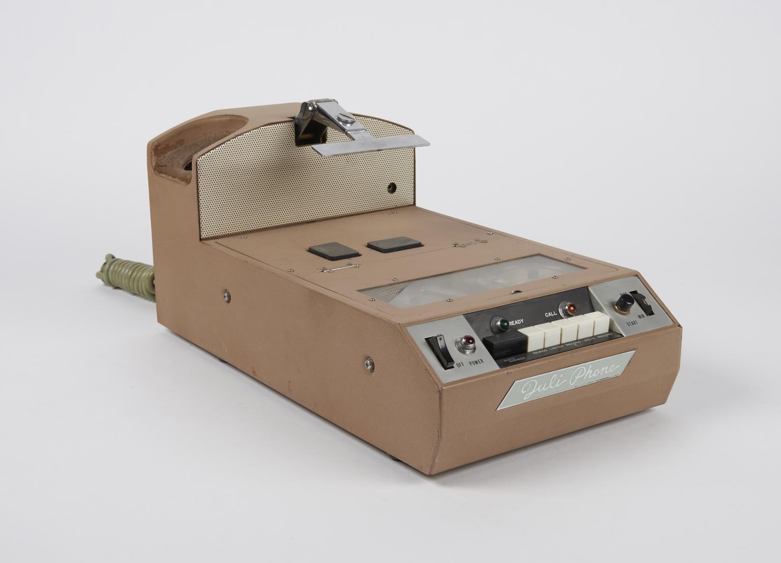 Telephone answering machines did not become widespread until the 1960s. At that time they were quite bulky machines and usually to be found only in offices. The Juli Phone, made in Japan in about 1970, is typical in its size and is solidly constructed. A small ‘activator transmitter’ was included which could be carried around by the owner and used to play over incoming messages on a telephone remote from the machine, for example at the owner’s home.