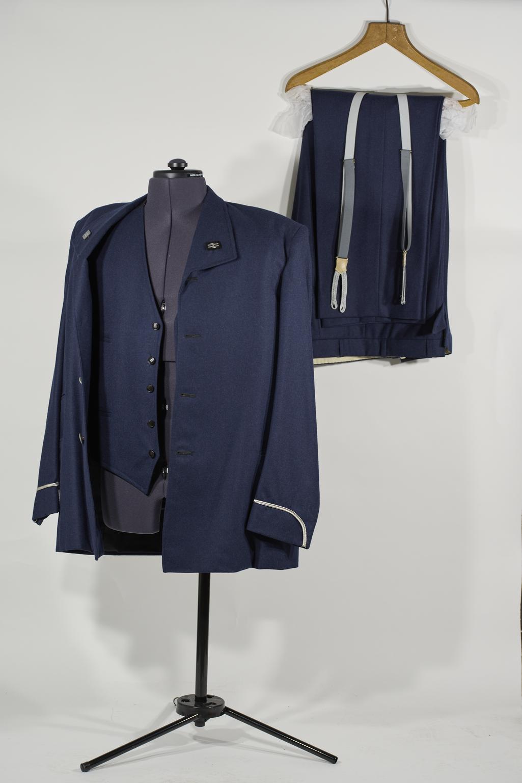 Single-breasted jacket, waistcoat, trousers and trouser braces for Goods Manager uniform. British Railways, pre. 1967 style, midnight blue. Issued to Albert Edward Marriott, Goods Manager, Euston station. Jacket has two BR logo collar pins.