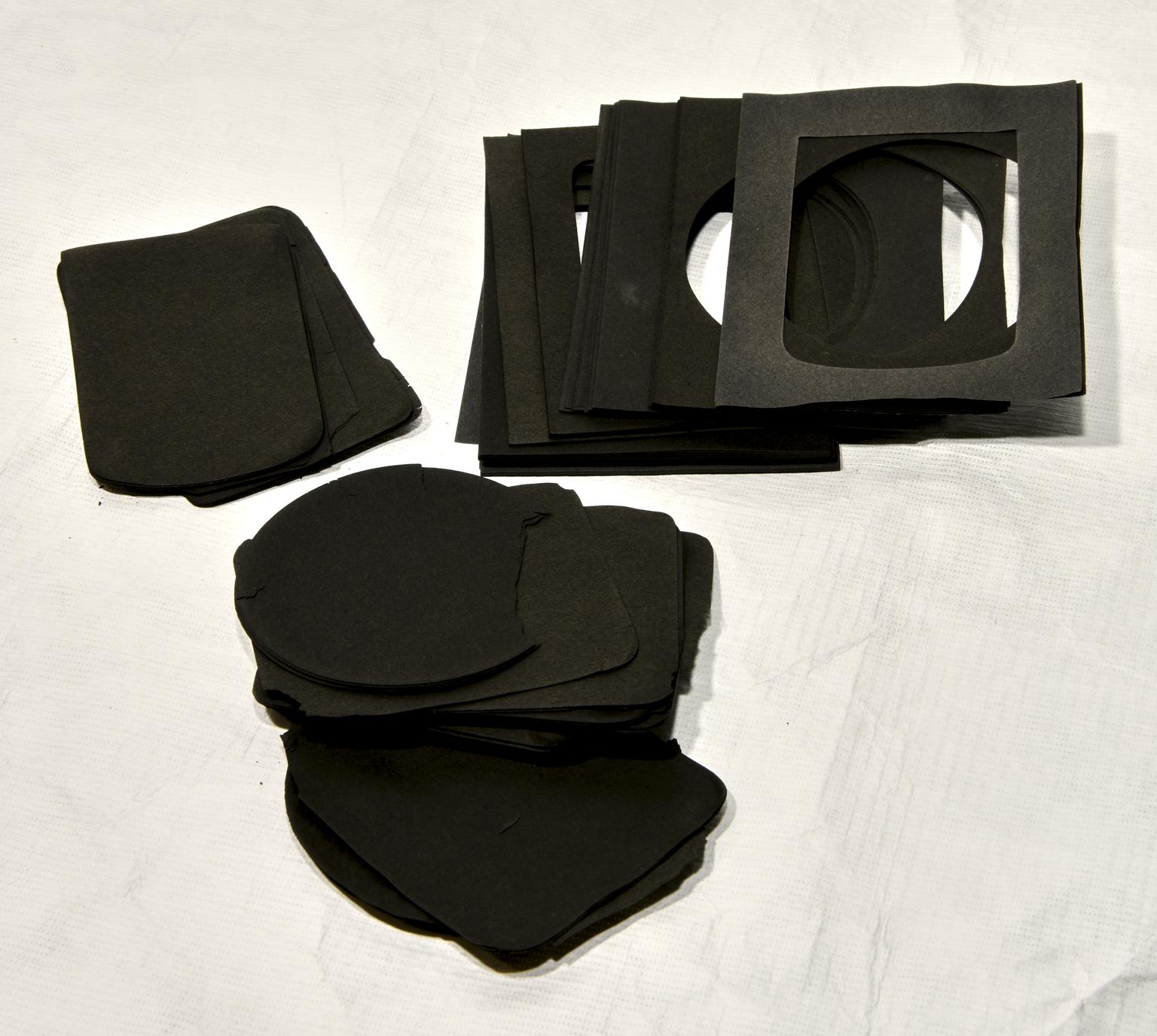1/4 inch plate size black paper masks: round, oval, domed, large and smaller rectangular apertures; inside the original carton.