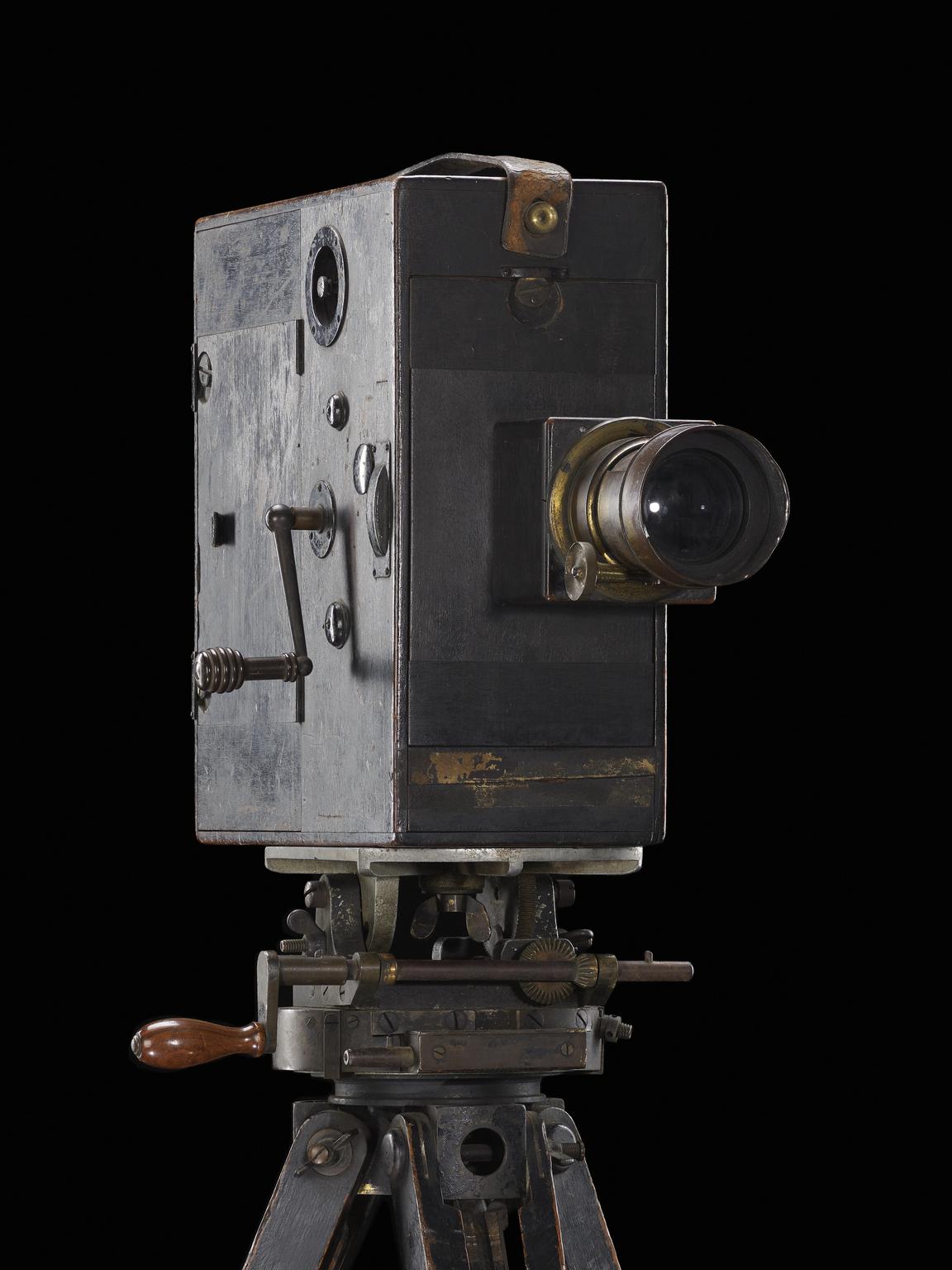 Heavy black staned wooden tripod with extending legs. For use with 35mm hand cranked motion picture camera owned and used by natural history photographer and cinematographer Cherry Kearton (1871-1940),