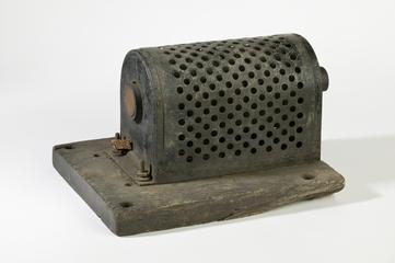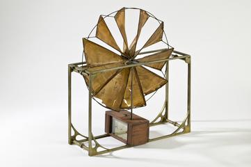 - Glass and metal manometer on a wooden stand with metal brackets., glass, metal and wood