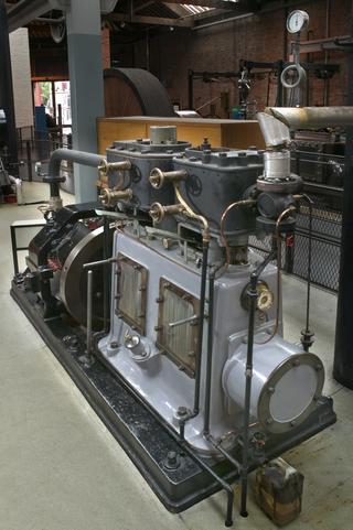 Before steam turbines were developed, large reciprocating steam engines like this were the most important means of generating alternating electric current. This engine originally generated electricity at Lambeth Power Station in London. Instead of a flywheel, it was fitted with an alternator which convert the movement of the engine into electricity. This engine was a very advanced design for 1900. It had pressurised lubrication to all main bearings and balance weights fitted on the crankshaft. These features ensured that it would run smoothly at the (then) very high speed of 300 rpm required to generate alternating current at the standard rate of 50 cycles per second.