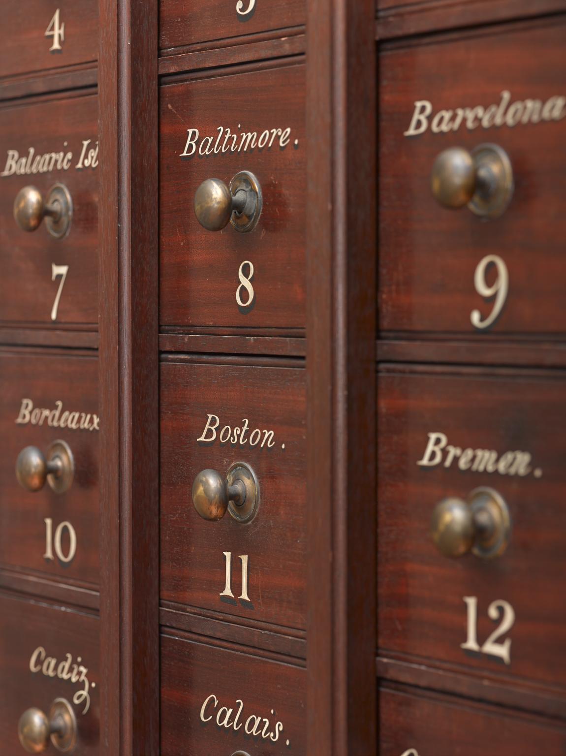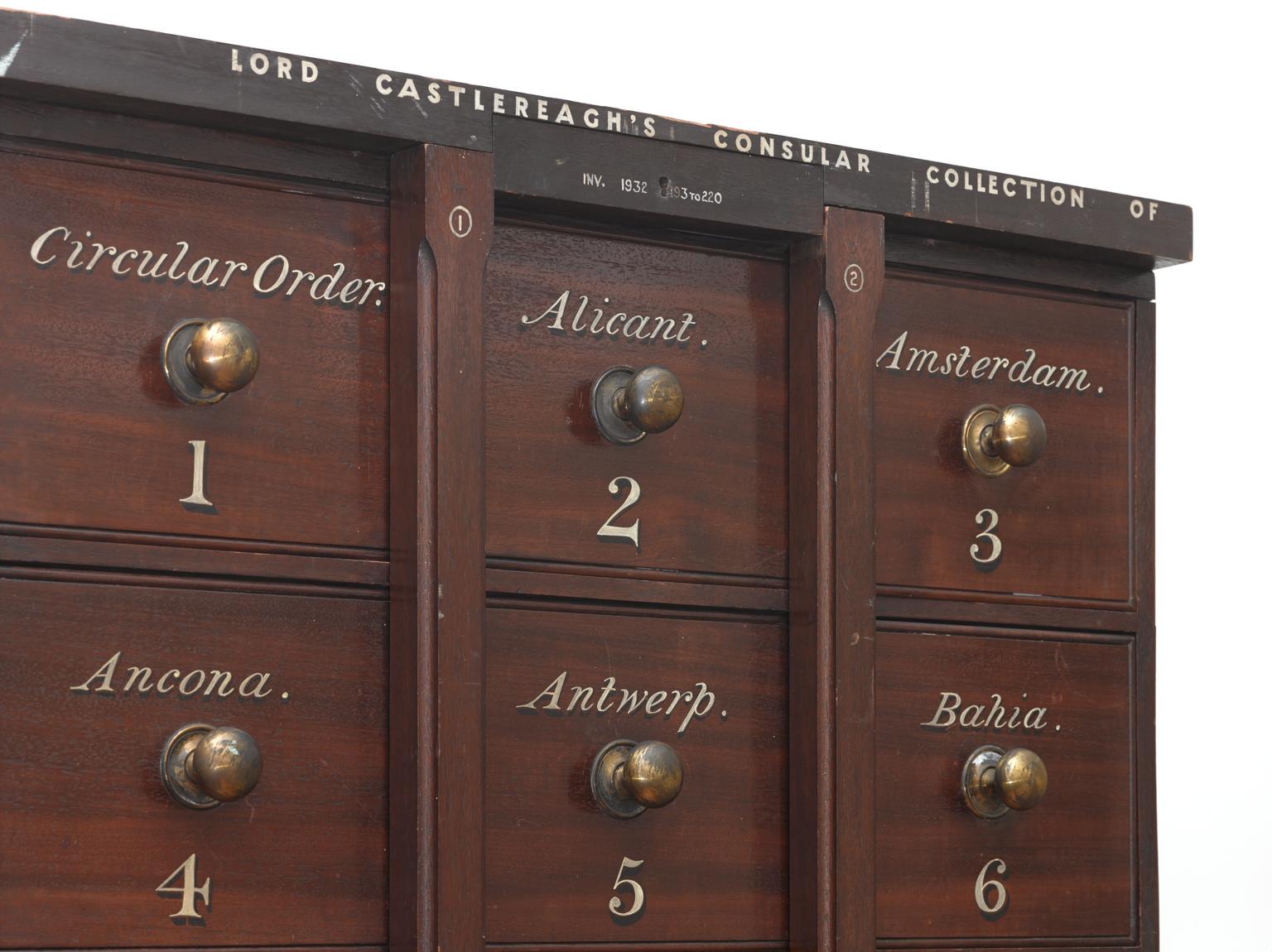 36-drawer wooden cabinet, with drawers numbered 1 to 36, from the Viscount Castlereagh Collection of weights, unsigned, 1815-1818